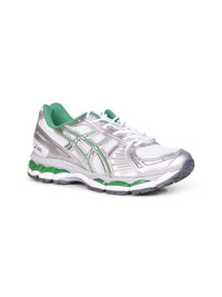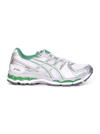 - Front lace-up fastening - Layered synthetic leather upper with open mesh underlays; silver and green inserts - Dope dyed recycled sockliner mesh - Rearfoot and forefoot gel technology - Fluidride technology - White color - 100% eco-leather - Made in extra eu Furs & Skins: Eco Leather100 % Made in: Vietnam Season: A25 1203A759U-100