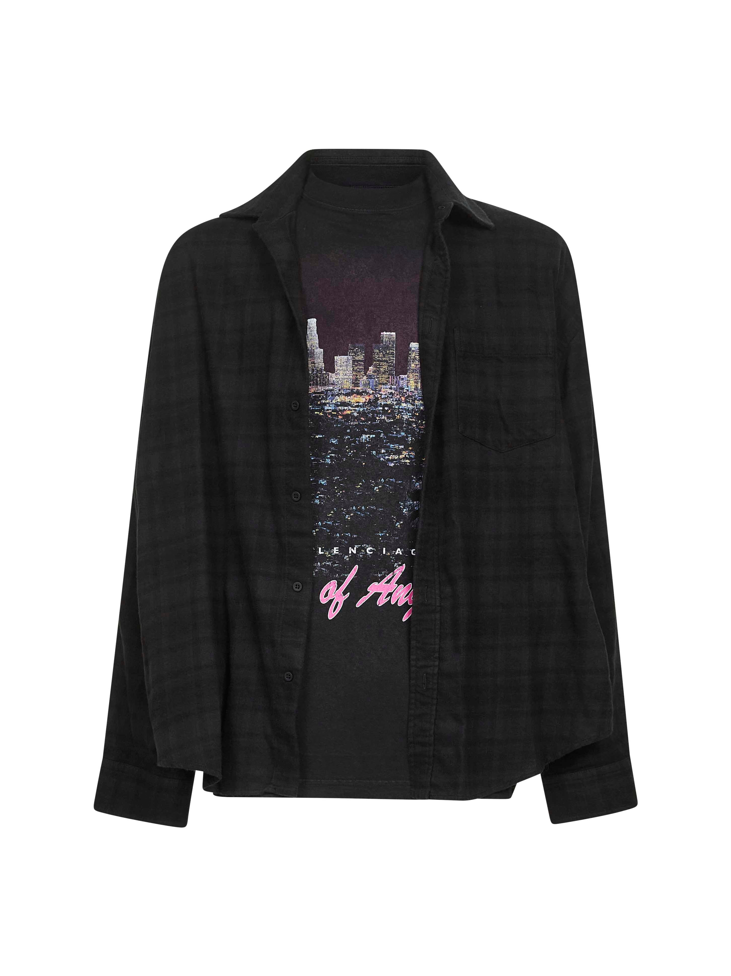 - Front button placket - Classic collar - Long sleeves, buttoned cuffs - City of angels artwork printed at front - Patch pocket at chest - Rounded hem - Balenciaga engraved buttons - Trompe l'oeil shirt on t-shirt-effect regenerated checked cotton poplin and dry jersey design; layered effect - Large fit - Black color - 100% cotton - Made in italy Natural (Veg): Cotton100 % Made in: ITALIA Season: A25 839196TSM301852