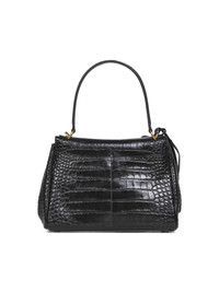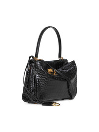 - Foldover-top with metal twist lock fastening - Top leather handle; detachable leather shoulder strap - Detachable leather key ring with two open metal rings - Interior: one main gusseted compartment, one zip pocket, lambskin lining; exterior: large front gusseted pocket, two flat pockets at back - Snap buttons at sides - Four brass feet - Antique gold-toned metal hardware - Crocodile embossed calfskin leather design - 29 x 20 x 10 cm; handle drop: 18.5 cm, shoulder strap drop: 56.3 cm - Black color - 100% calf leather - Made in italy Furs & Skins: Calf Leather100 % Made in: ITALIA Season: A25 7897792AA5L1000