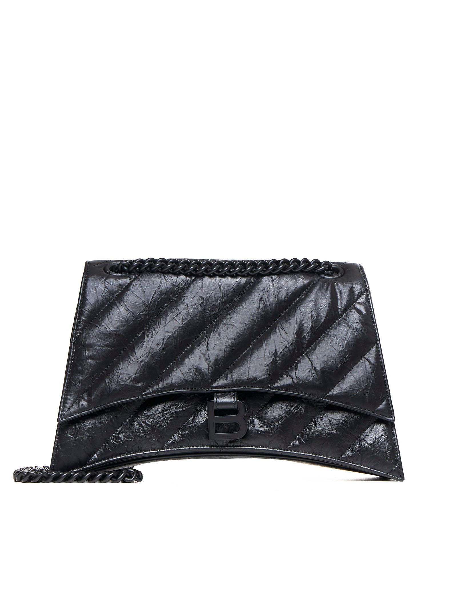 Balenciaga’s Crush Chain medium bag in supple black wrinkled effect leather featuring quilted diagonal striped motif, signature rounded silhouette, sliding chain shoulder strap, B logo plaque on the lapel, concealed magnetic fastening, internal zip pocket and silver-tone and black enameled metal hardware. Color: Black Size and fit: 31 x 20 x 9 cm Strap: 66 cm Composition: 100% calfskin Country of manifacture: Italy ID designer: 785602210IY1000