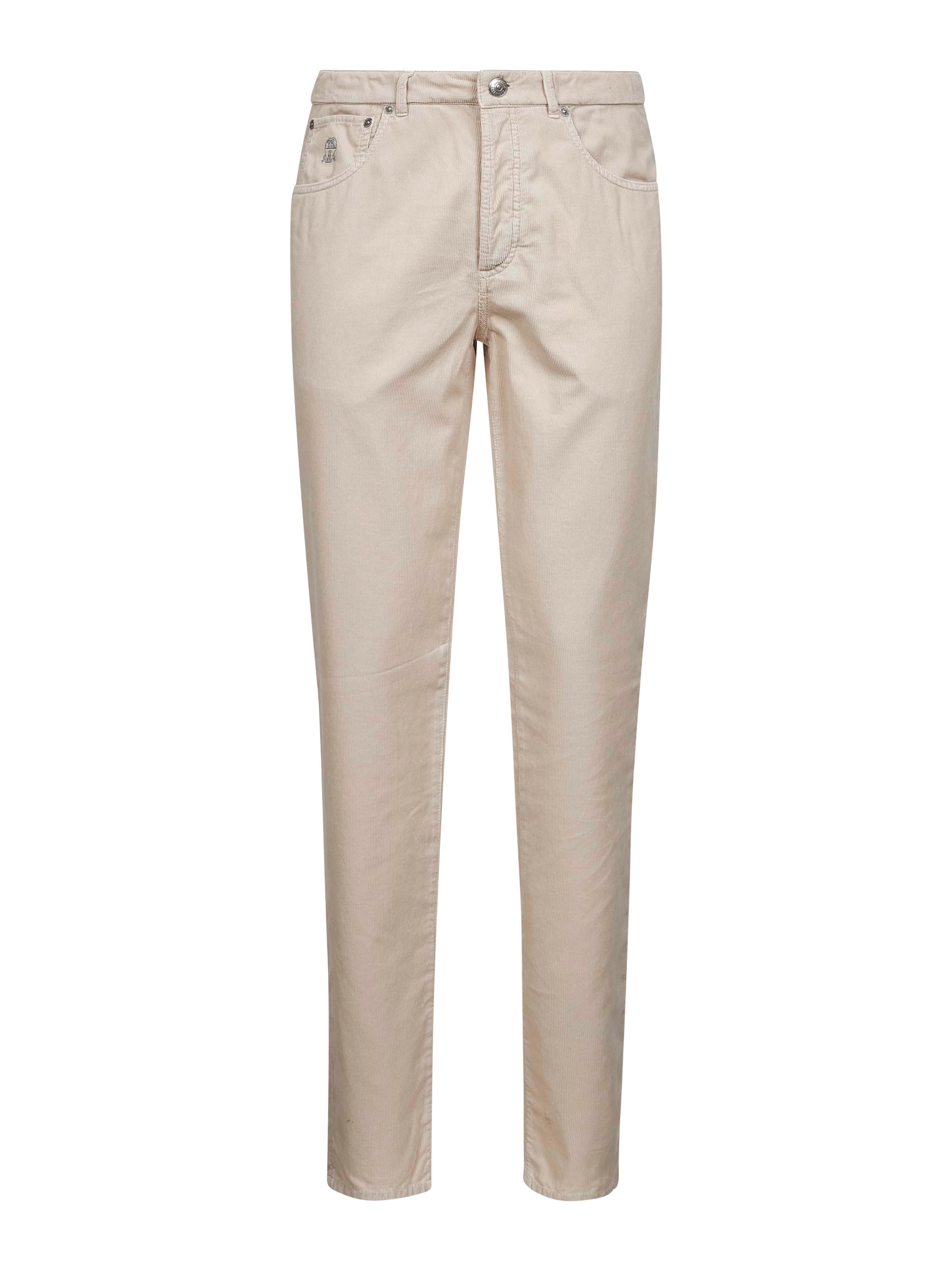 - Button fly closure, metal logo button - Regular waist with belt loops - Five-pocket model - Embroidered solomeo crest at coin pocket; embossed logo patch at back waistband - Thin ribbed texture garment-dyed cotton corduroy design - Italian fit - Beige color - 100% cotton - Made in italy Natural (Veg): Cotton100 % Made in: ITALIA Season: A25 M279UI1780-C6024