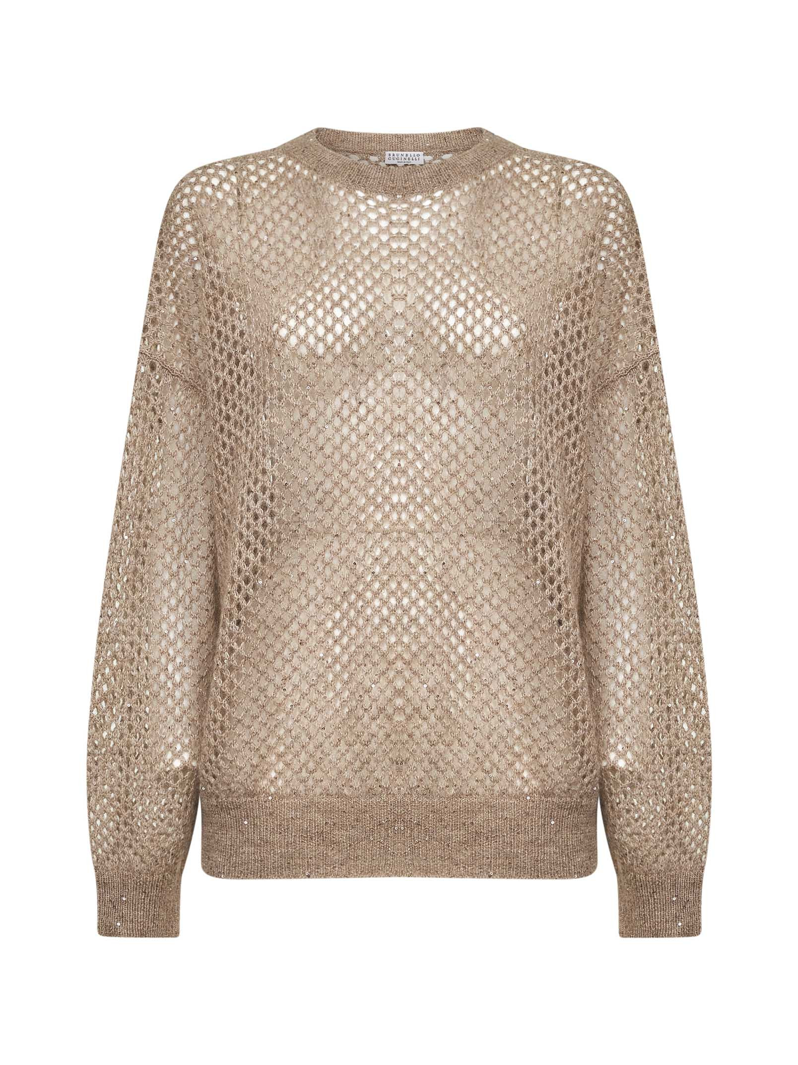 - Ribbed crewneck - Long sleeves, dropped shoulders - Ribbed cuffs and bottom band - Mohair, cotton and wool blend net stitch knit design with small sequins embedded into the yarn - Relaxed fit - Beige color - 42% mohair, 30% polyamide, 12% cotton, 11% wool, 5% polyester - Made in italy Made in: ITALIA Season: A25 MPS732400P-C3592