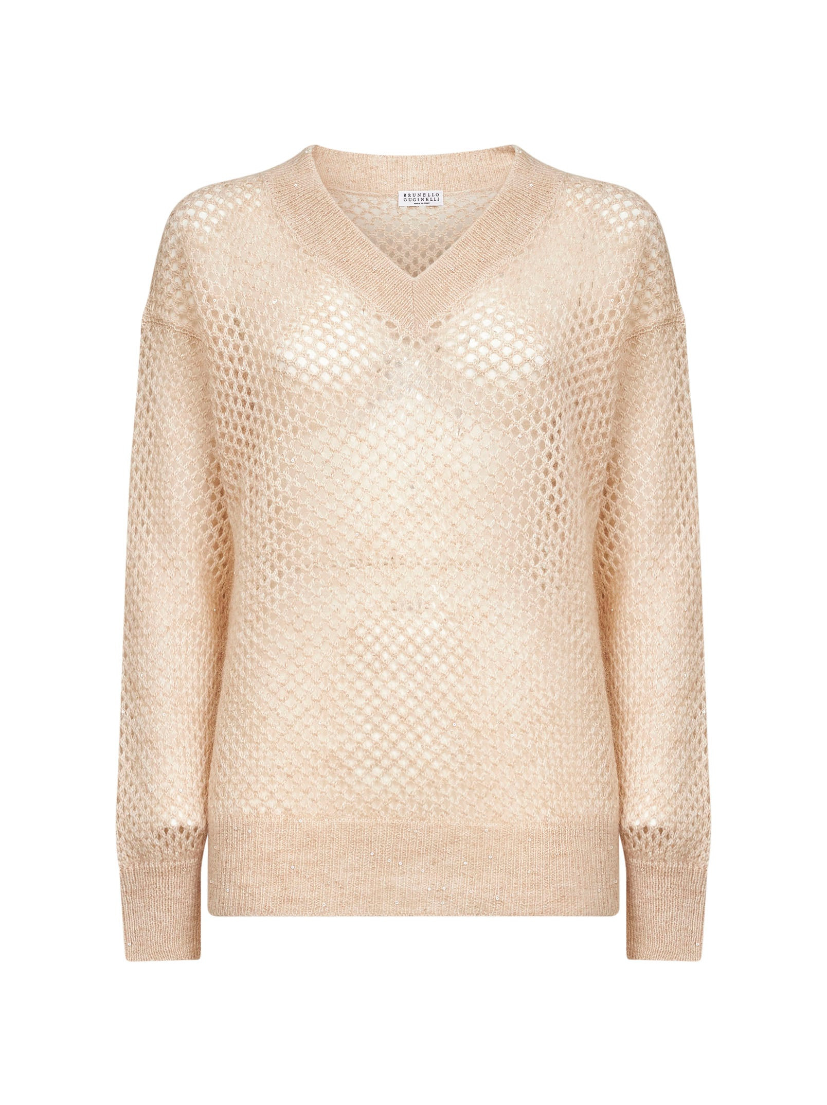 - Ribbed v-neck - Long sleeves, dropped shoulders - Ribbed cuffs and bottom band - Mohair, cotton and wool blend net stitch knit design with small sequins embedded into the yarn - Relaxed fit - Beige color - 42% mohair, 30% polyamide, 12% cotton, 11% wool, 5% polyester - Made in italy Wool or fine animal hair: Wool78 % Synthetic: Polyamide12 % Natural (Veg): Cotton10 % Made in: ITALIA Season: A25 MPS732412P-C3590