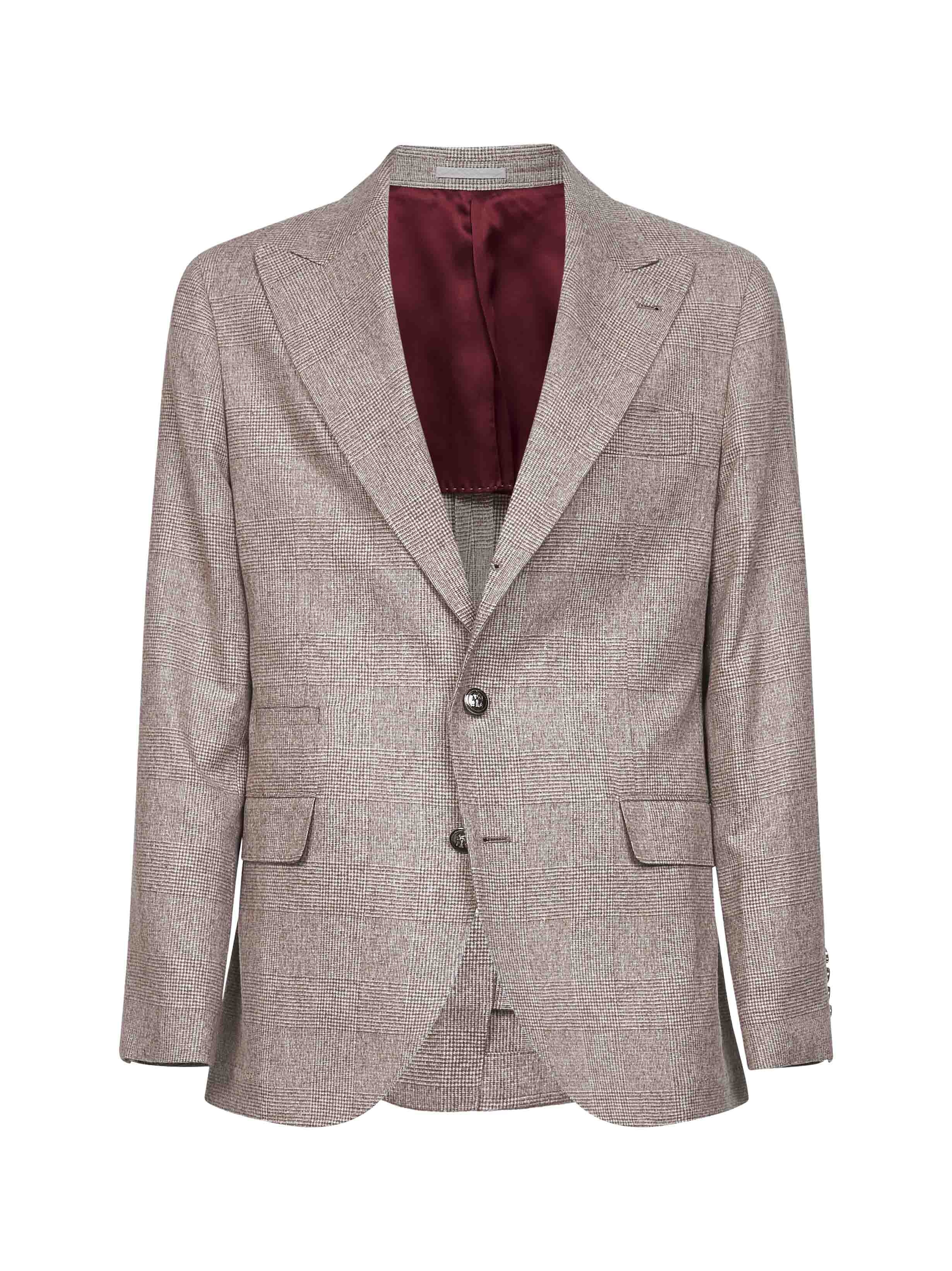 - Single-breasted three-button placket - Large peak lapel - Long sleeves, ''solomeo shoulder'', four-button cuffs - Welt waist pockets with flap, welt ticket pocket, chest pocket, inner pockets - Side slits at back - Embossed metal buttons - Half cupro lining - Silk, wool and cashmere flecked prince of wales flannel design; drop 7 - Beige color - 51% silk, 47% wool, 2% cashmere - Made in italy Natural (Other): Silk51 % Wool or fine animal hair: Wool47 % Wool or fine animal hair: Cashmere2 % Made in: ITALIA Season: A25 MA4797BFD2-C162