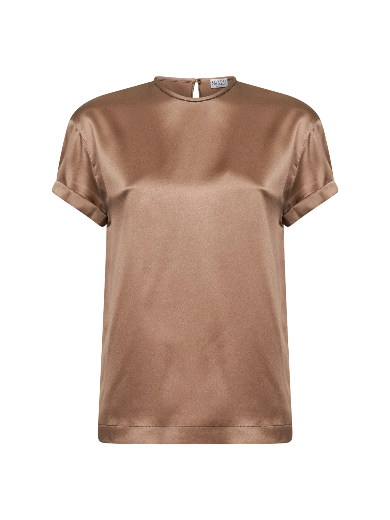 - Button closure at neck back; keyhole cut-out - Crewneck with nickel-free monili embroidery - Short sleeves, dropped shoulders, turn-up hems - Straight hem - Relaxed fit - Beige color - 96% silk, 4% elastane - Made in italy Natural (other): Silk96 % Synthetic: Elastane4 % Made in: ITALIA Season: P26 M0C59DE310-C9237