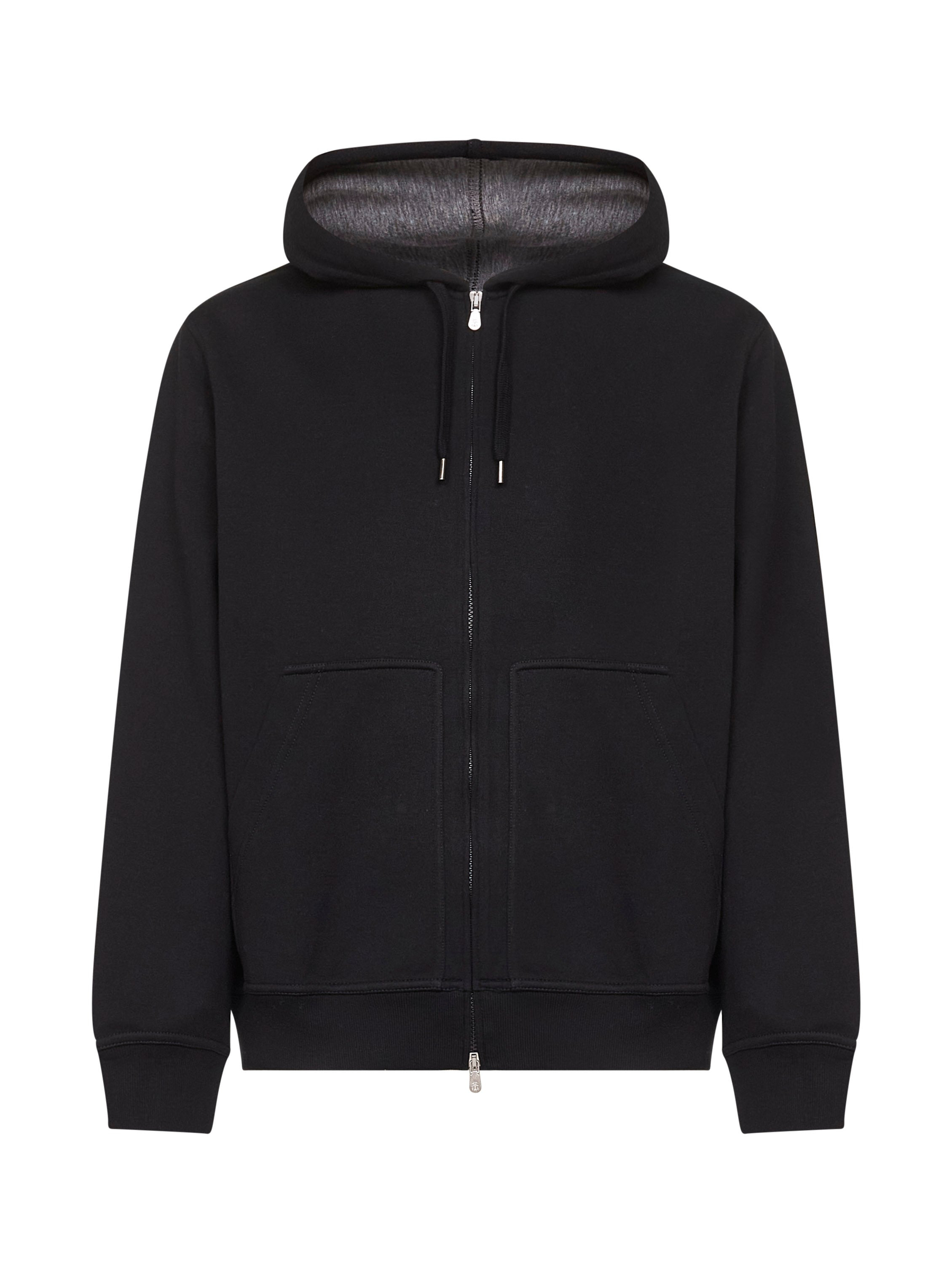 - Front double-slider zip closure - Lined hood with adjustable drawstring - Long sleeves - Patch pockets at front - Elasticated ribbed cuffs and bottom band - Contrasting interior - Regular fit - Black color - 65% cotton, 24% polyamide, 7% cashmere, 4% silk - Made in italy Natural (Veg): Cotton69 % Synthetic: Polyamide24 % Wool or fine animal hair: Cashmere7 % Made in: ITALIA Season: A25 MM8319069G-C101
