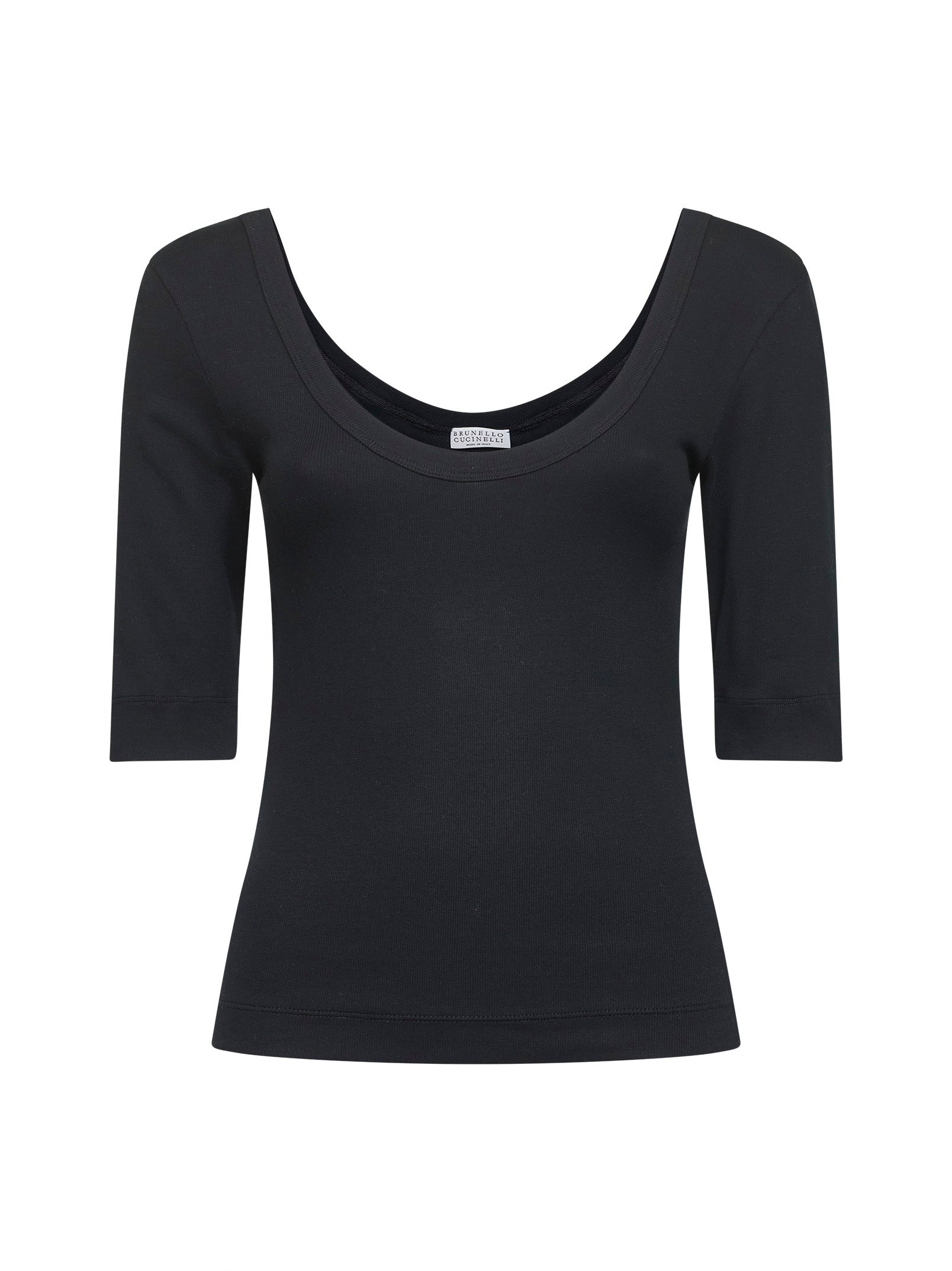 - Wide front and back neckline; nickel-free monili embroidery at back neckline - Three-quarter sleeves - Straight hem - Ribbed stretch cotton jersey design - Regular fit - Black color - 94% cotton, 6% elastane - Made in italy Made in: Season: A25 M0TC8FX220-C101