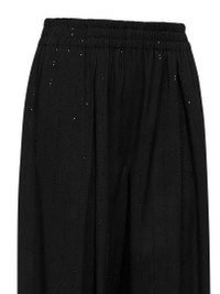 - Covered front closure - Elasticated waistband - Side pockets - Single front pleat - Vertical striped pattern with sequins embroidered in the thread - Wide straight leg - Black color - 95% viscose, 3% polyamide, 2% polyester - Made in italy Synthetic: viscose95 % Synthetic: Polyamide3 % Synthetic: Polyester2 % Made in: ITALIA Season: P26 ML594HX699-C101