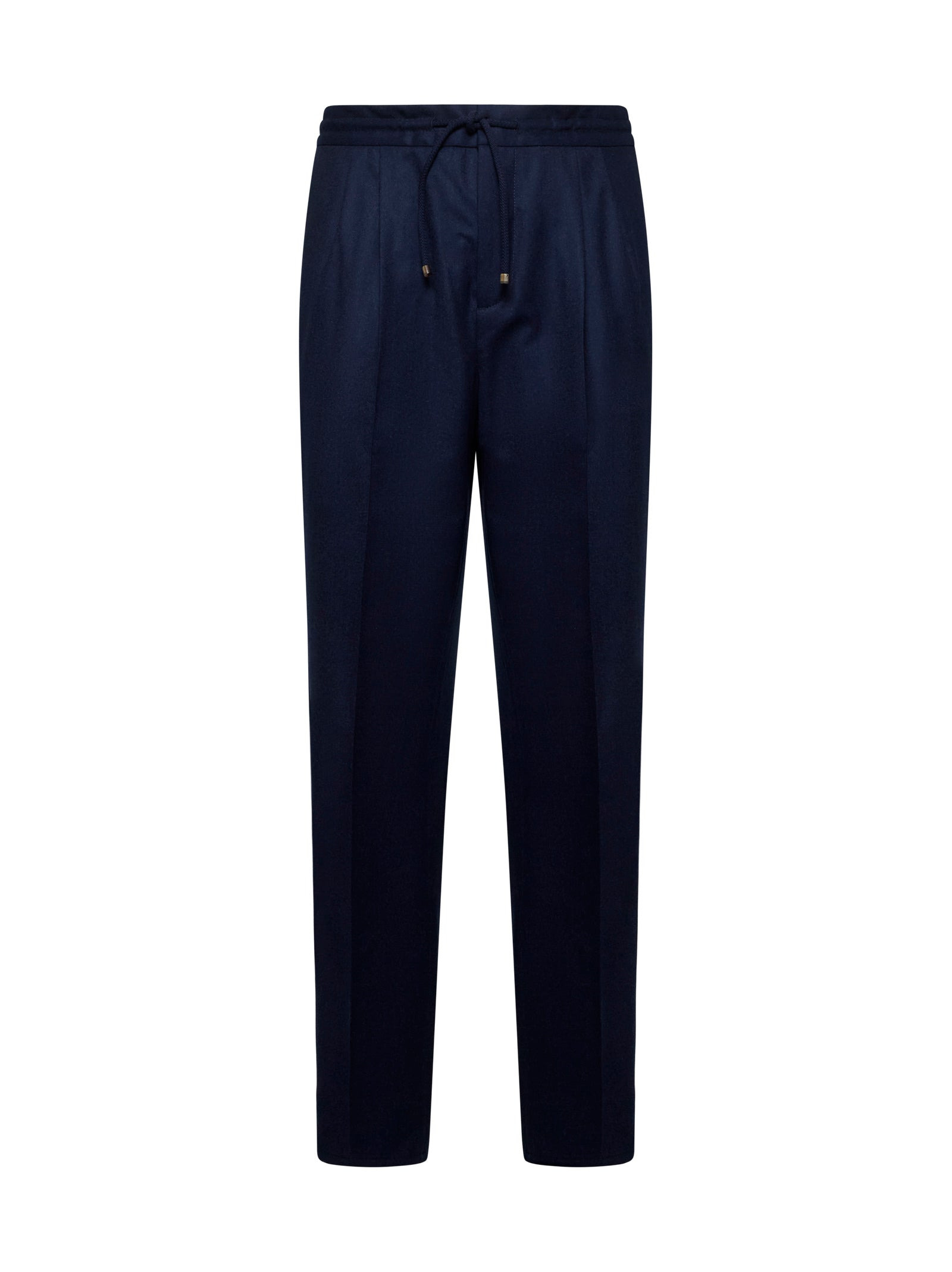 Covered front closure Elasticated waistband with adjustable drawstring Side slant pockets, back welt pockets Double pleat Tapered leg Leisure fit Blue color 100% Virgin Wool Made in Italy Size and fit: Model is 184 cm tall and wears size IT 48 Country of manifacture: ITALIA ID designer: ME226E1710-C396