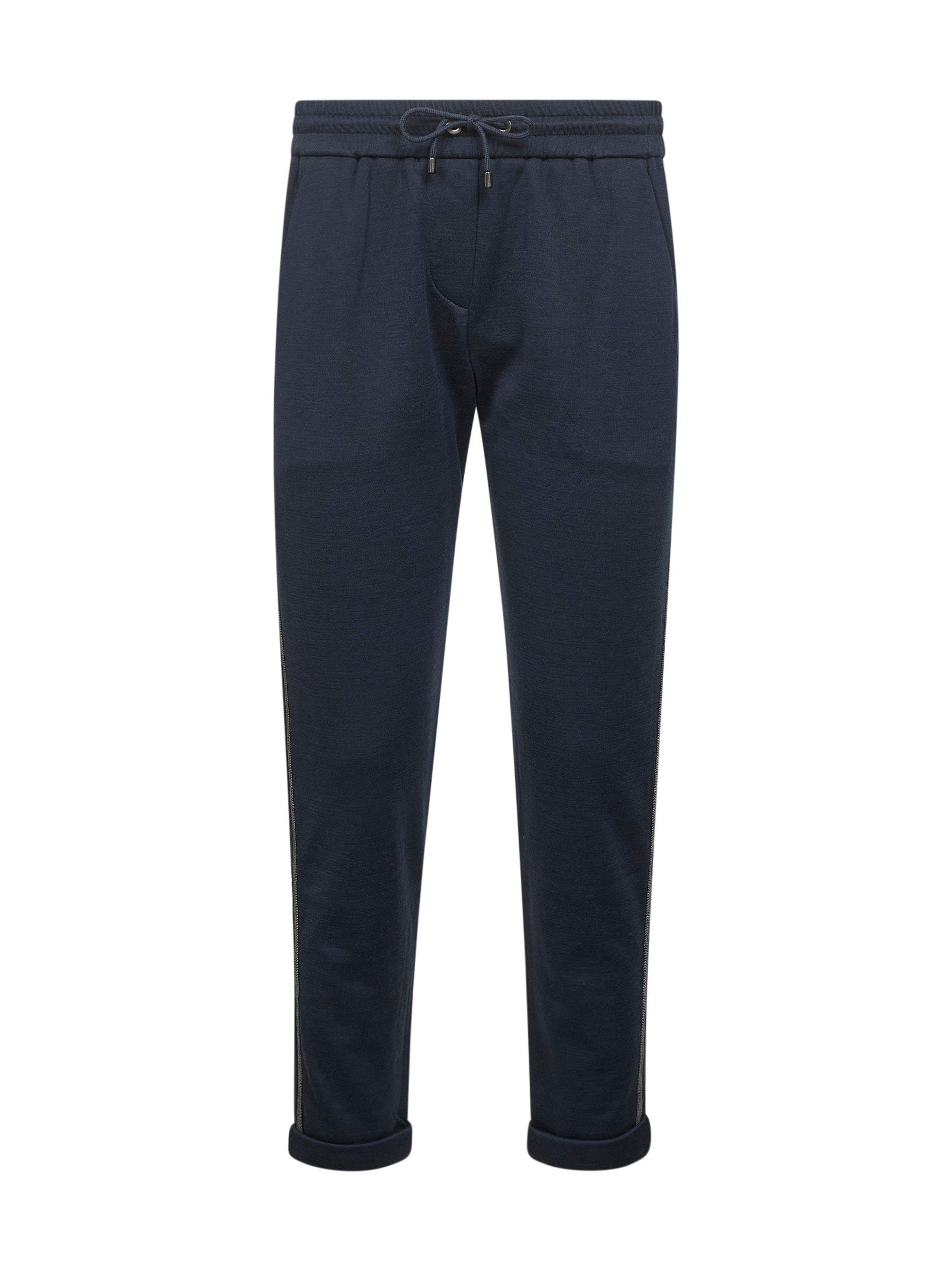 - Elasticated waistband with adjustable drawstring - Side pockets, back welt pockets - Thin nickel-free monili stripes embroidered at sides - Turn-up hems - Comfort cotton and silk interlock design - Blue color - 67% cotton, 31% silk, 2% polyamide - Made in italy Natural (Veg): Cotton67 % Natural (Other): Silk31 % Synthetic: Polyamide2 % Made in: ITALIA Season: A25 MP828SM679-C8366
