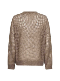 - Ribbed crewneck - Long wide sleeves, dropped shoulders - Ribbed cuffs and bottom band - Net knit design with small sequins embedded into the yarn - Relaxed fit - Brown color - 42% mohair, 30% polyamide, 12% cotton, 11% wool, 5% polyester - Made in italy Wool or fine animal hair: Mohair56 % Synthetic: Polyamide28 % Natural (Veg): Cotton16 % Made in: ITALIA Season: A25 MPS732400-C3592