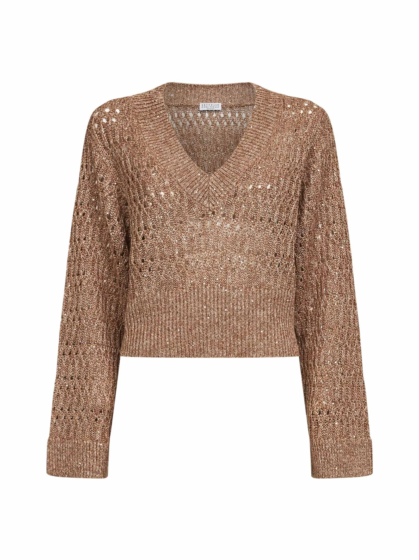 - Ribbed v-neck - Wide long sleeves, dropped shoulders - Ribbed cuffs and wide bottom band - Mixed-stitch openwork cable knit design with sequin thread embellishment - Relaxed fit - Brown color - 94% linen, 6% nylon - Made in italy Natural (Veg): Linen/Flax94 % Synthetic: Nylon6 % Made in: ITALIA Season: P26 MCO564702-C8585