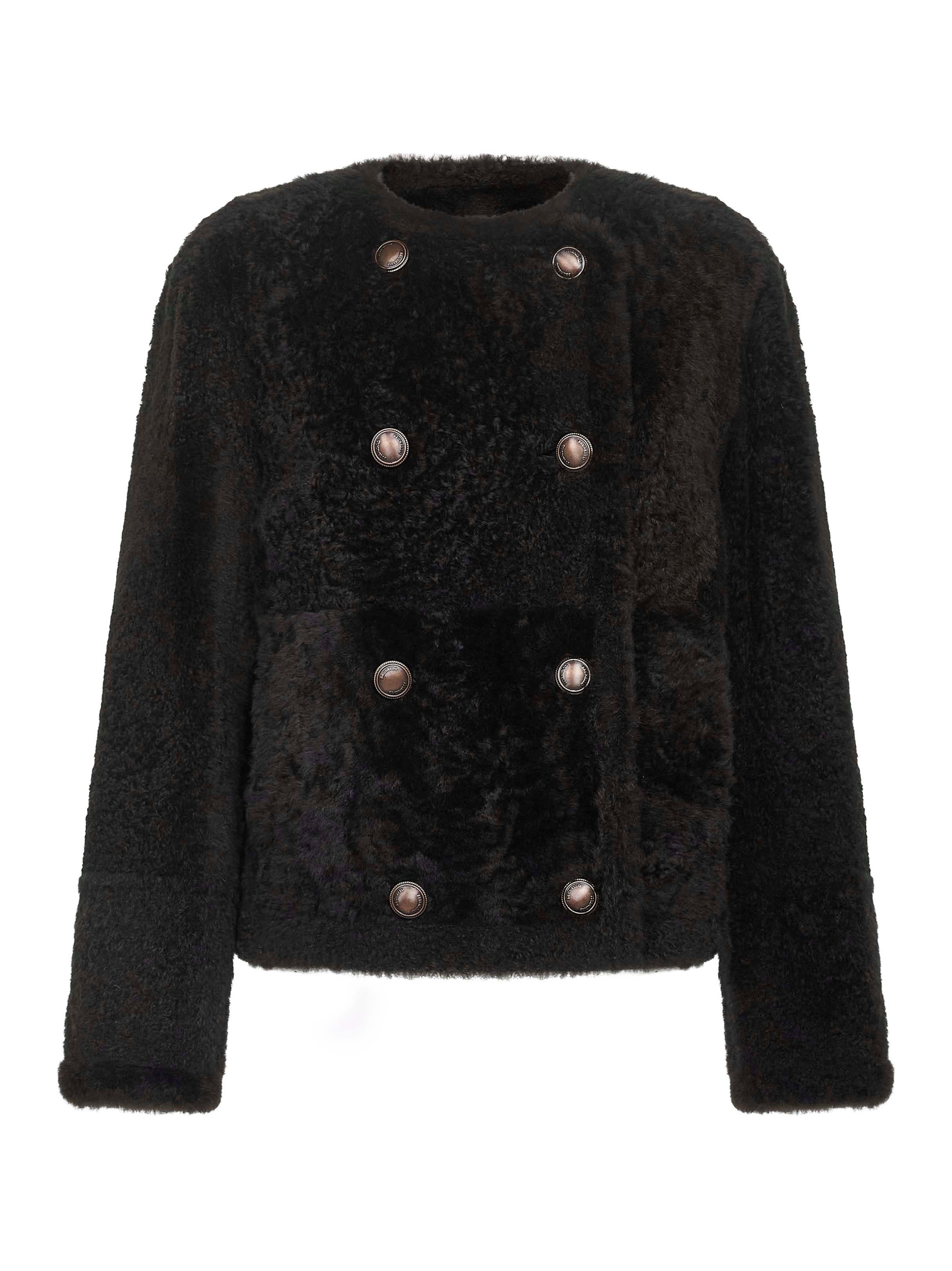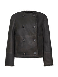 - Double-breasted six-button placket; metal buttons at shearling side - Crewneck - Long sleeves - Side welt pockets - Reversible fuzzy shearling and matte and aged-effect nappa leather design - Slightly cropped cut - Brown color - 100% lambskin - Made in italy Furs & Skins: Lamb Skin100 % Made in: ITALIA Season: A25 MPMBP7426-C2390