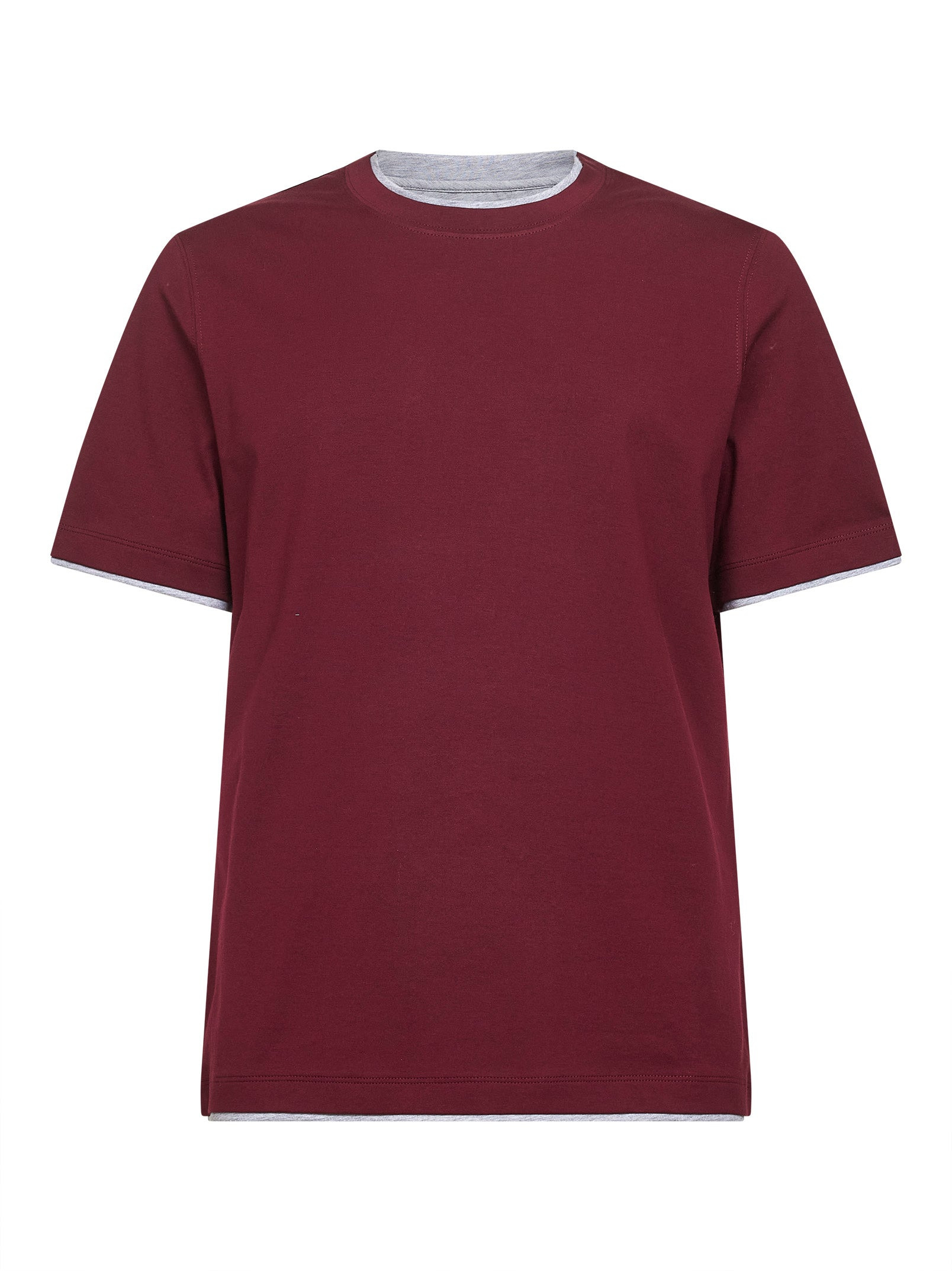 - Crewneck - Short sleeves with flat pressed hem - Flat pressed hem - Layered-effect grey edge detailing at crewneck, sleeves and hem - Regular fit - Burgundy color - 100% cotton - Made in italy Natural (Veg): Cotton100 % Made in: ITALIA Season: A25 M0B137427-COA16