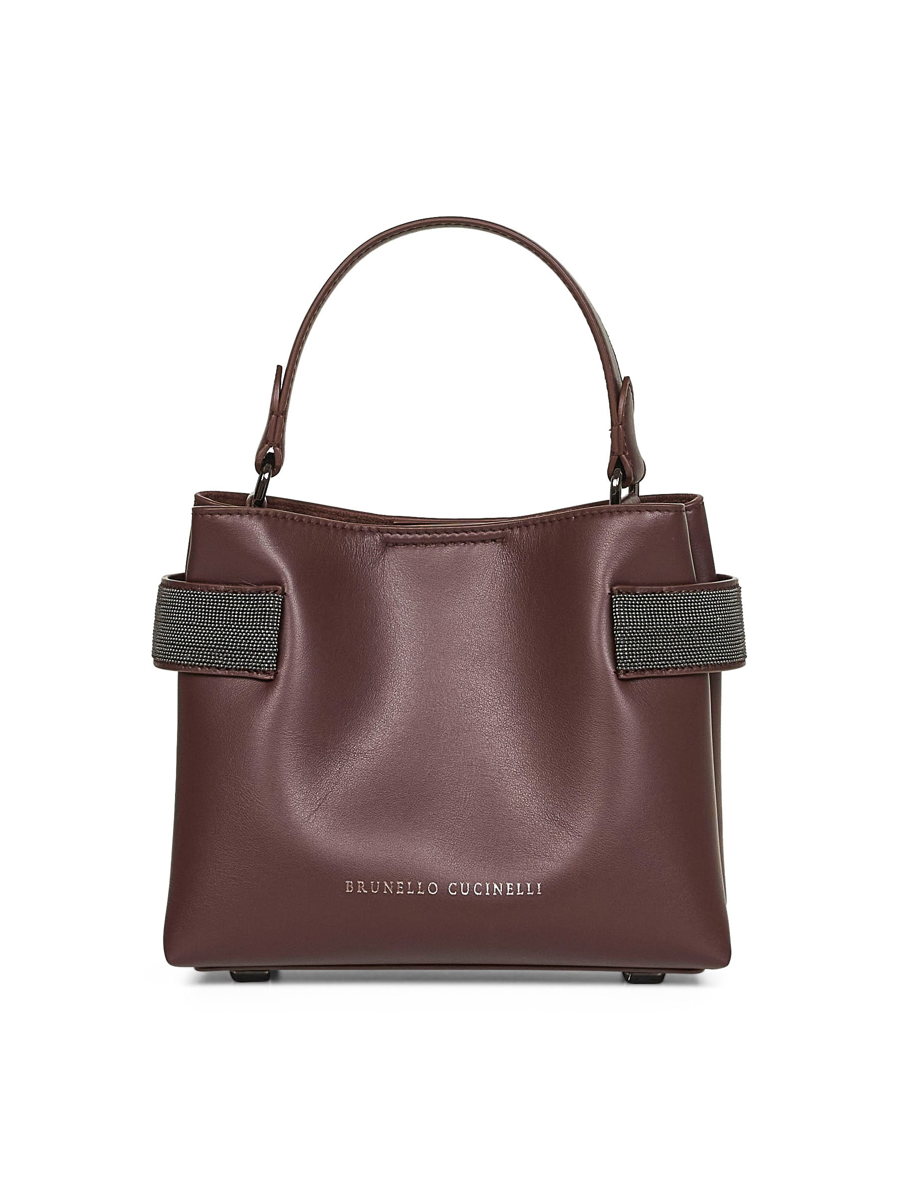 - Magnetic fastening - Leather top handle; adjustable and detachable leather shoulder strap - Embossed logo lettering at front - Precious bands leather side bands with nickel-free monili embroidery - Interior: two main open compartments, one slip pocket; suede lining - Calf leather design - 19 x 17 x 9 cm; shoulder strap drop: 48 cm - Burgundy color - 100% calf leather (bos taurus) - Made in italy Furs & Skins: Bos Taurus100 % Made in: ITALIA Season: A25 MBTKD2499-C4181