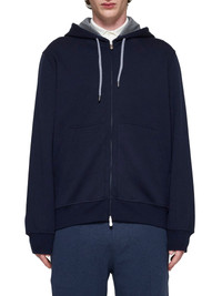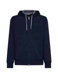 Brunello Cucinelli’s cobalt blue cotton blend hoodie featuring a hood with adjustable drawstring, front zip, front kangaroo pockets, ribbed edges and melange grey lining. Color: Cobalt blue Size and fit: Model is 184 cm tall and wearing a size M Composition: 64% cotton 26% polyamide 10% other materials Country of manifacture: Italy ID designer: MM8319069G-C1265