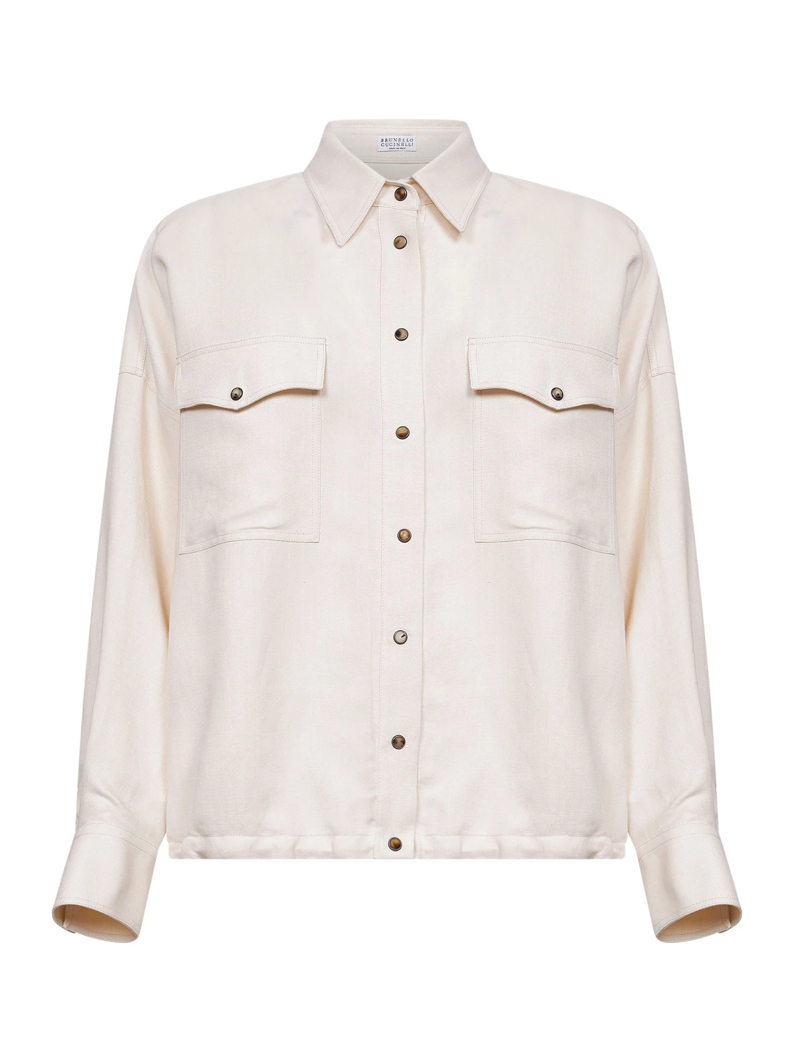 - Front snap button placket - Classic collar - Long sleeves, dropped shoulders, snap-buttoned cuffs - Patch pockets at chest with snap-buttoned flap - Western back yoke - Hem with adjustable drawstring - Relaxed fit - Cream color - 72% viscose, 28% linen - Made in italy Synthetic: viscose72 % Natural (Veg): Linen/Flax28 % Made in: ITALIA Season: P26 MH126NE416-C579