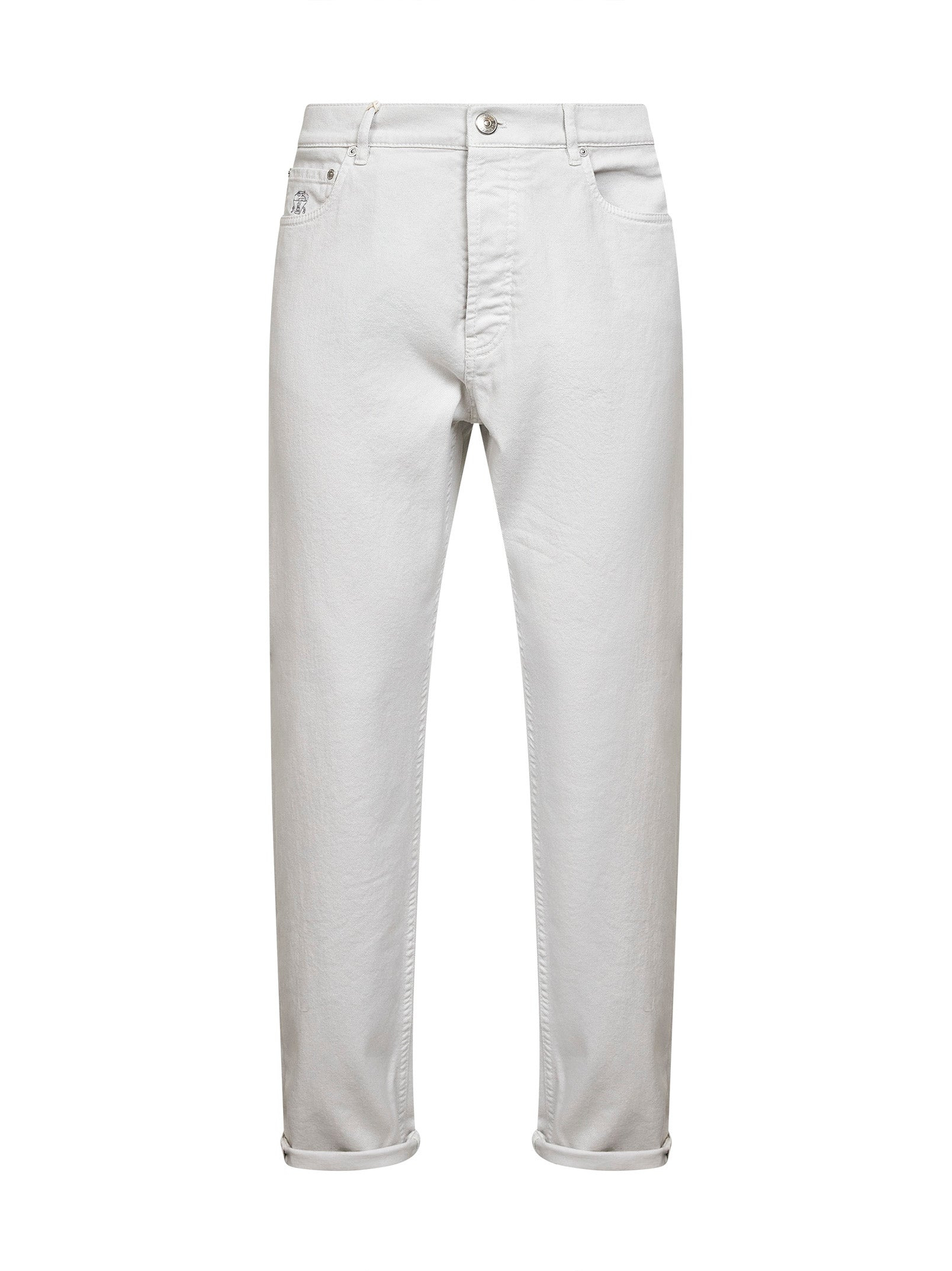 - Front button-fly closure, metal logo button - Slightly high-rise waist with belt loops - Five-pocket model - Contrasting solomeo crest embroidery at coin pocket; leather logo patch at back waistband - Regular leg - Garment-dyed design - Iconic fit - Grey color - 99% cotton, 1% elastane - Made in italy Natural (Veg): Cotton99 % Synthetic: Elastane1 % Made in: ITALIA Season: A25 M277UO1090-C7023