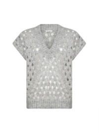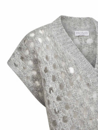 - Ribbed v-neck - Cap sleeves - Ribbed bottom band - Wispy mohair and wool net stitch knit design with small sequins running through the yarn - Relaxed fit - Grey color - 54% mohair, 26% polyamide, 15% polyester, 5% wool - Made in italy Made in: Season: A25 MNA326502-CJJ46