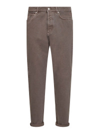 - Front button-fly closure, metal logo button - Slightly high-rise waist with belt loops - Five-pocket model - Leather logo patch at back waistband; solomeo crest embroidery at coin pocket - Regular leg - Garment-dyed model - Iconic fit - Hazelnut color - 100% cotton - Made in italy Natural (Veg): Cotton100 % Made in: ITALIA Season: P26 M237PO1090-C7503
