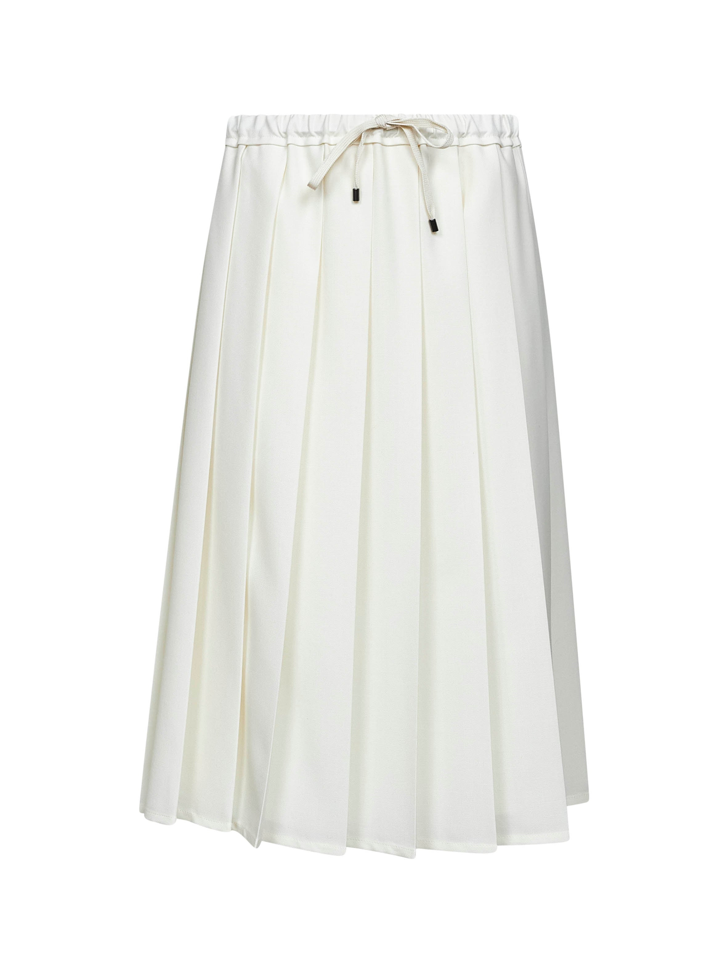 - Elasticated waistband with adjustable drawstring - Silk blend crepe lining - Techno virgin wool canvas design; flat pleats - Midi length - Ivory color - 55% polyester, 45% virgin wool - Made in italy Wool or fine animal hair: Virgin Wool45 % Synthetic: Polyester55 % Made in: ITALIA Season: A25 MB147G3869-C9555