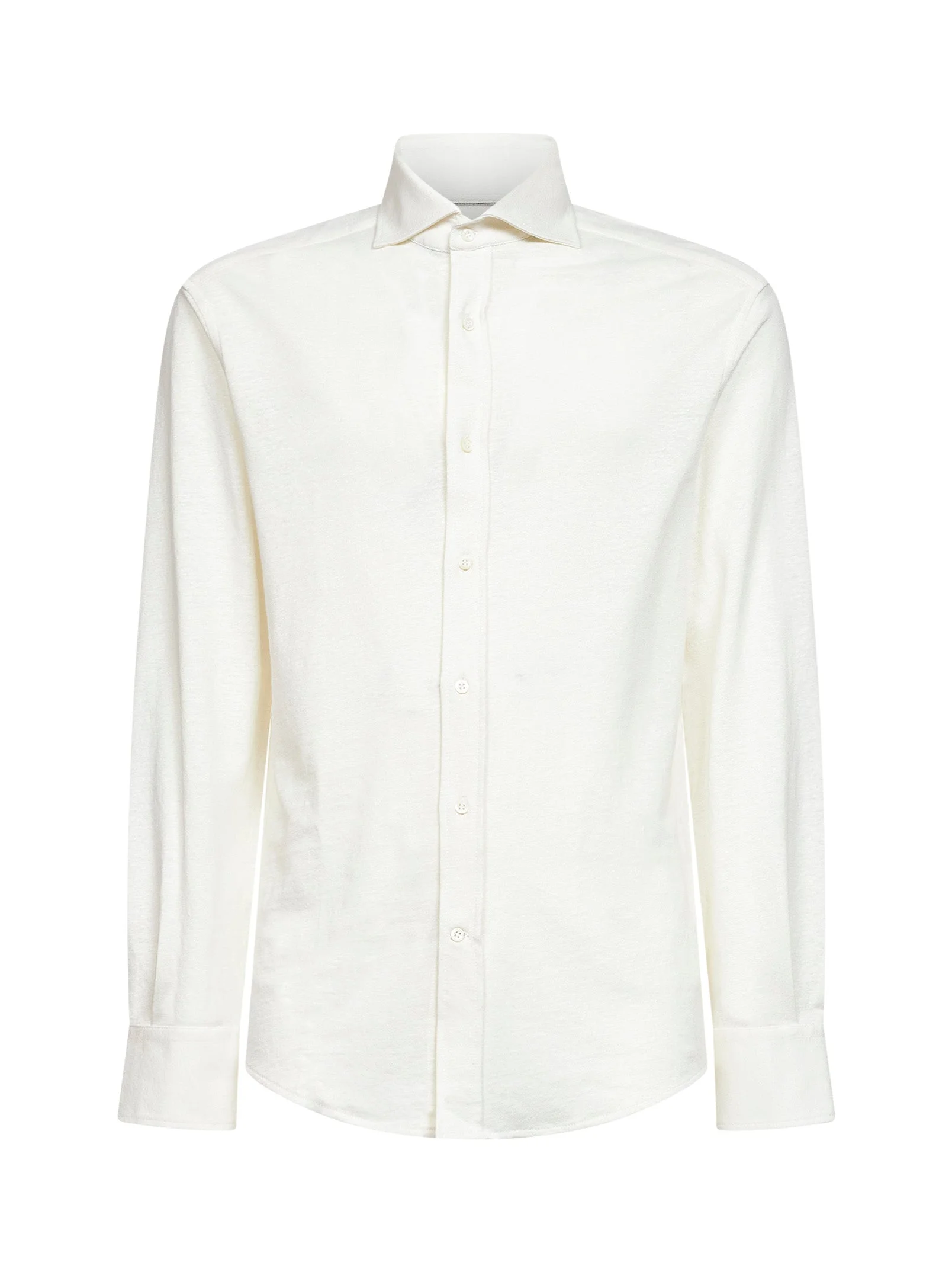 - Front button placket - Spread collar - Long sleeves, two-button cuffs - Back yoke - Curved hem - Mother-of-pearl buttons - Linen and cotton blend subtle slub-effect jersey - Regular fit - Ivory color - 74% linen, 26% cotton - Made in italy Natural (Veg): Linen/Flax74 % Natural (Veg): Cotton26 % Made in: ITALIA Season: P26 MR8276686-C044