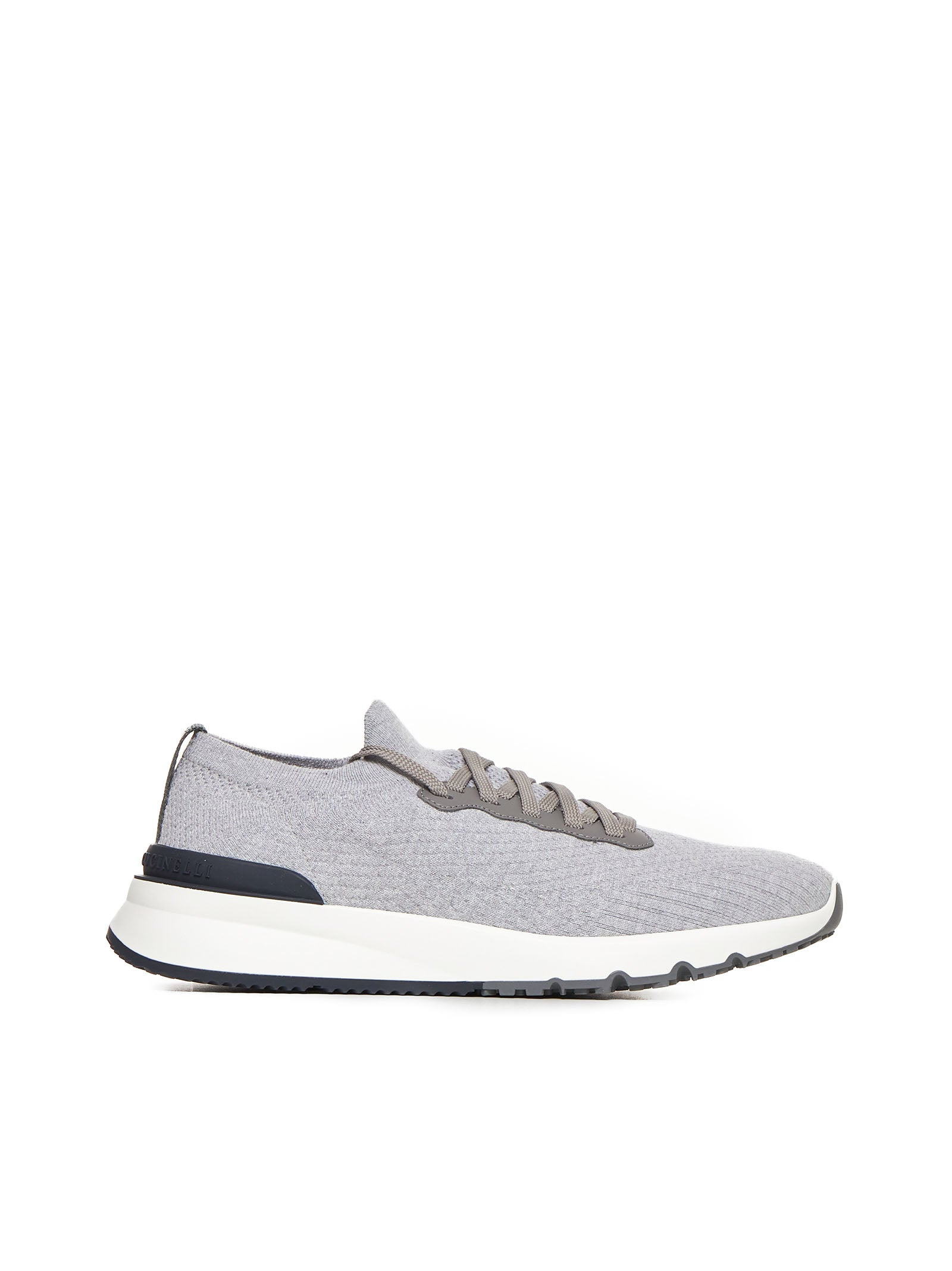 Brunello Cucinelli’s light grey cotton knit sneakers featuring front laces, grey leather details, grosgrain heel loop tab, blue rear insert with embossed lettering logo and rubber sole. Color: Light grey Composition: 100% cotton + 100% calfskin Country of manifacture: Italy ID designer: MZUPMBO252-CB308