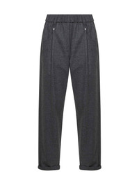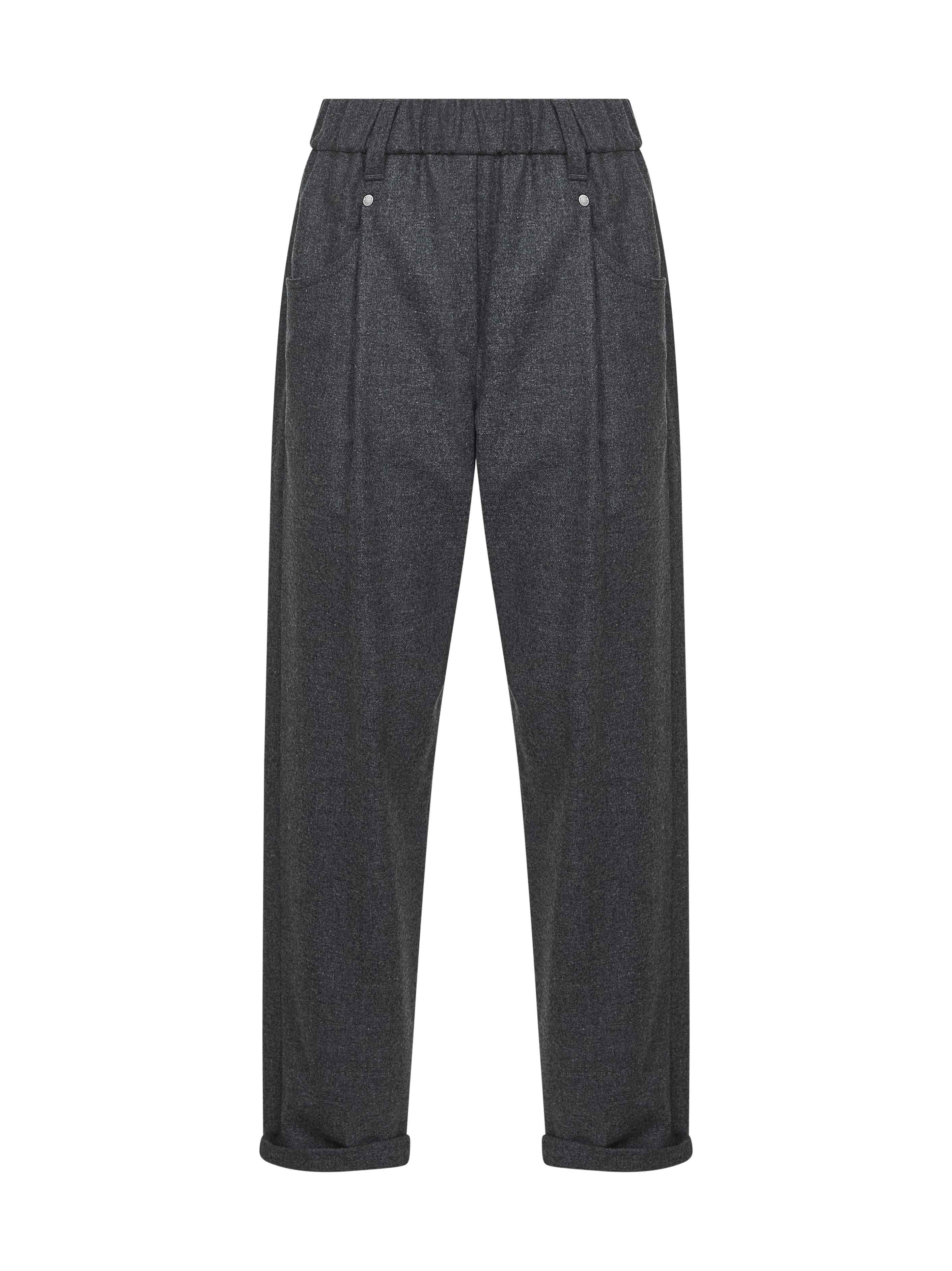 - Elasticated waistband - Waist with belt loops - Five-pocket model - Nickel-free monili label at back pocket - Single front pleat - Straight leg - Baggy fit - Lead grey color - 95% virgin wool, 5% cashmere - Made in italy Wool or fine animal hair: Virgin Wool95 % Wool or fine animal hair: Cashmere5 % Made in: ITALIA Season: A25 MB162P8417-C032