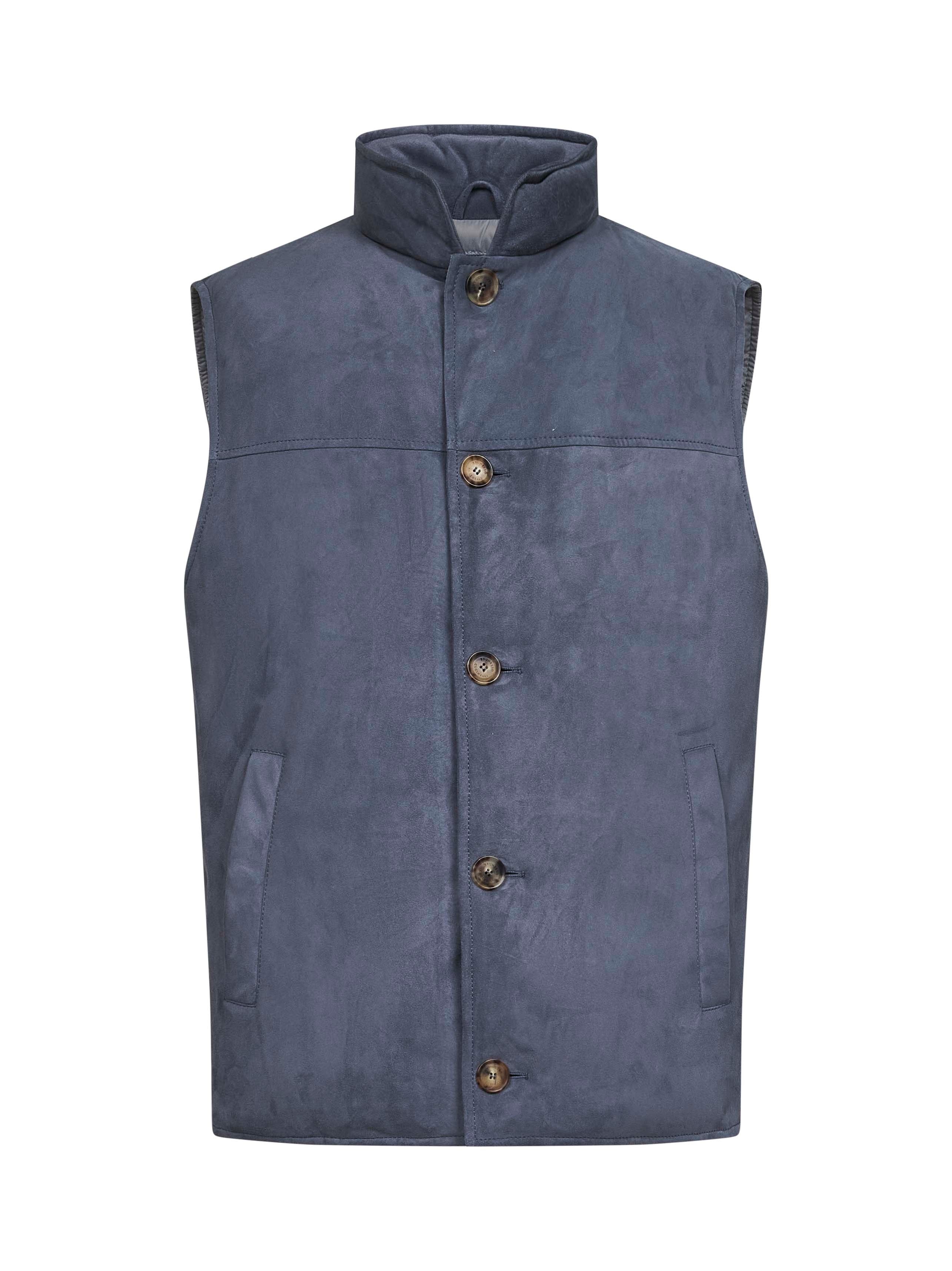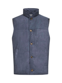 - Front horn button placket - Stand collar - Sleeveless - Side slanted welt pockets; inner pockets - Lined; high quality goose down and feather padding - Regular fit - Light blue color - 100% leather - Made in italy Furs & Skins: Leather100 % Made in: ITALIA Season: A25 MPCLF2013-C4249