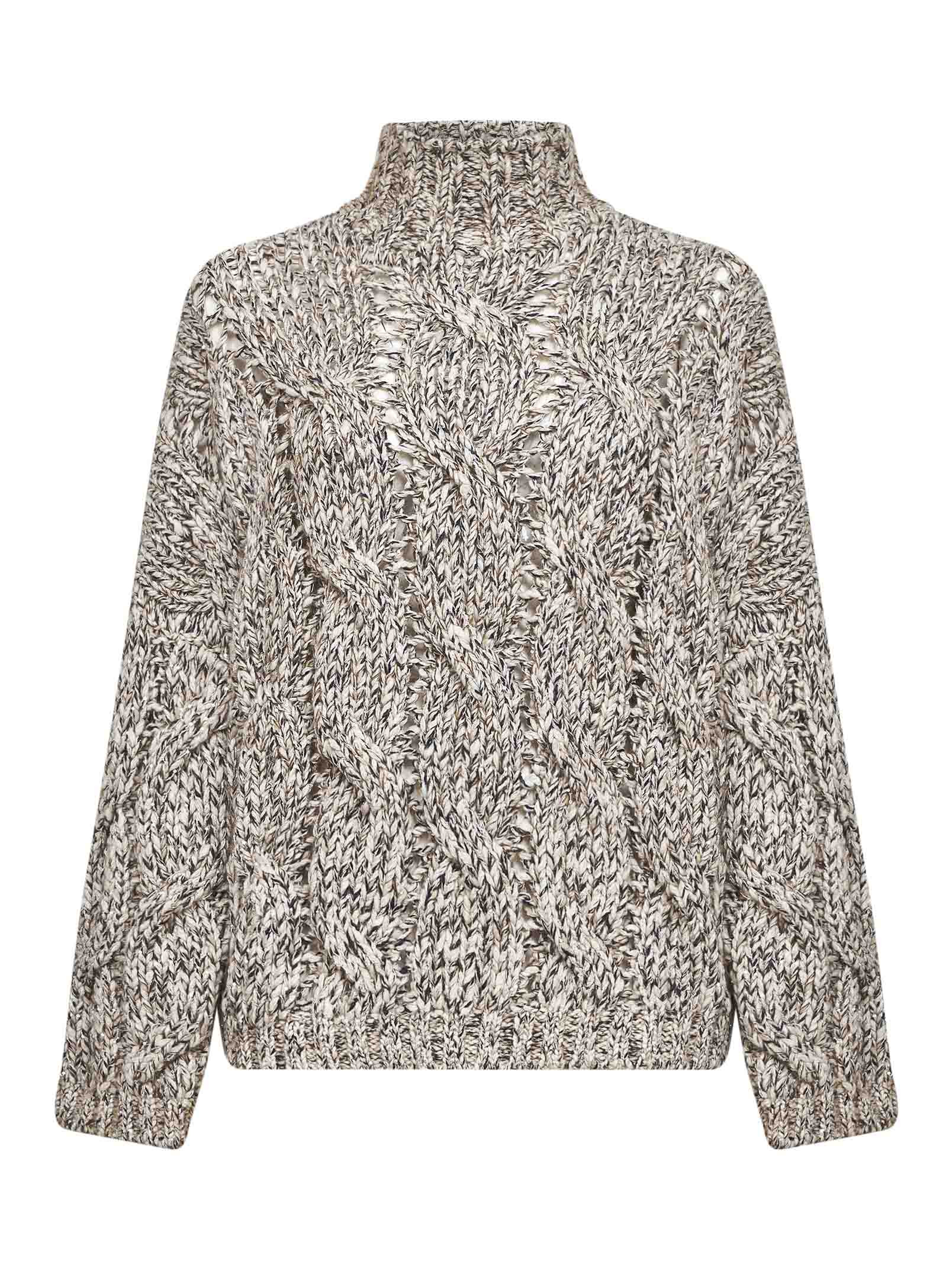 - Ribbed mock neck - Long sleeves, dropped shoulders - Ribbed cuffs and bottom band - Soft wool blend chine-effect cable knit and net stitching design with sequins yarn - Relaxed fit - Color: multicolor - 39% lambswool, 32% cashmere, 15% polyamide, 9% polyester, 5% mohair - Made in italy Wool or fine animal hair: Merino70 % Wool or fine animal hair: Wool30 % Made in: Season: A25 MGR372904-CME31