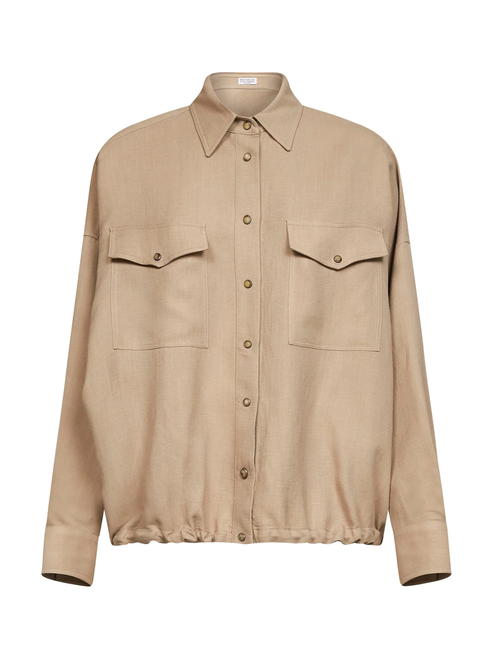 - Front snap button placket - Classic collar - Long sleeves, dropped shoulders, snap-buttoned cuffs - Patch pockets at chest with snap-buttoned flap - Western back yoke - Hem with adjustable drawstring - Relaxed fit - Sand color - 72% viscose, 28% linen - Made in italy Synthetic: viscose72 % Natural (Veg): Linen/Flax28 % Made in: ITALIA Season: P26 MH126NE416-C9195