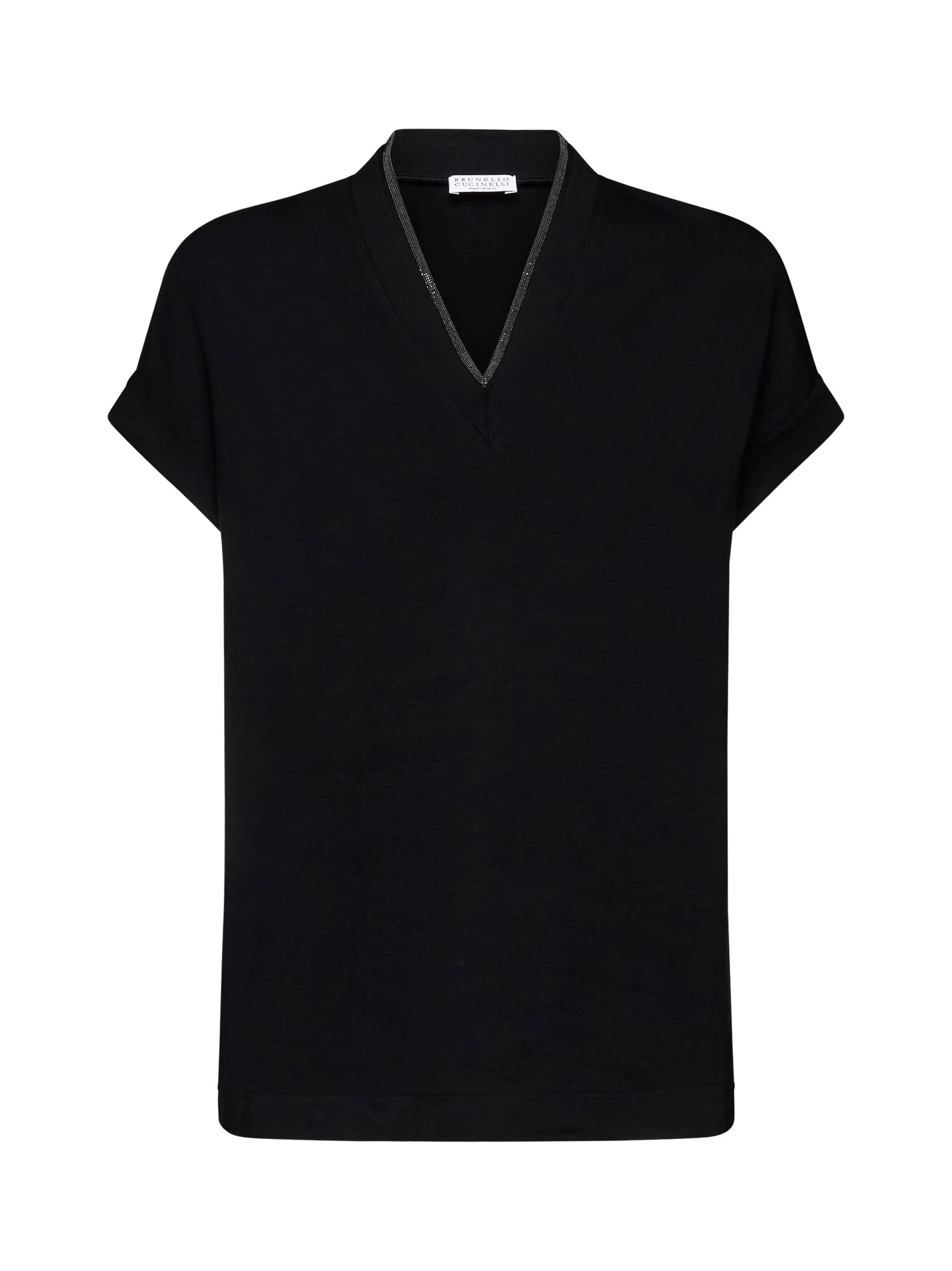 Brunello Cucinelli’s black stretch cotton with Monili V neck. Color: Black Size and fit: Model is 177 cm tall and wearing a size S Composition: 93% cotton 7% elastane Country of manifacture: Italy ID designer: M0T18BD222-C101