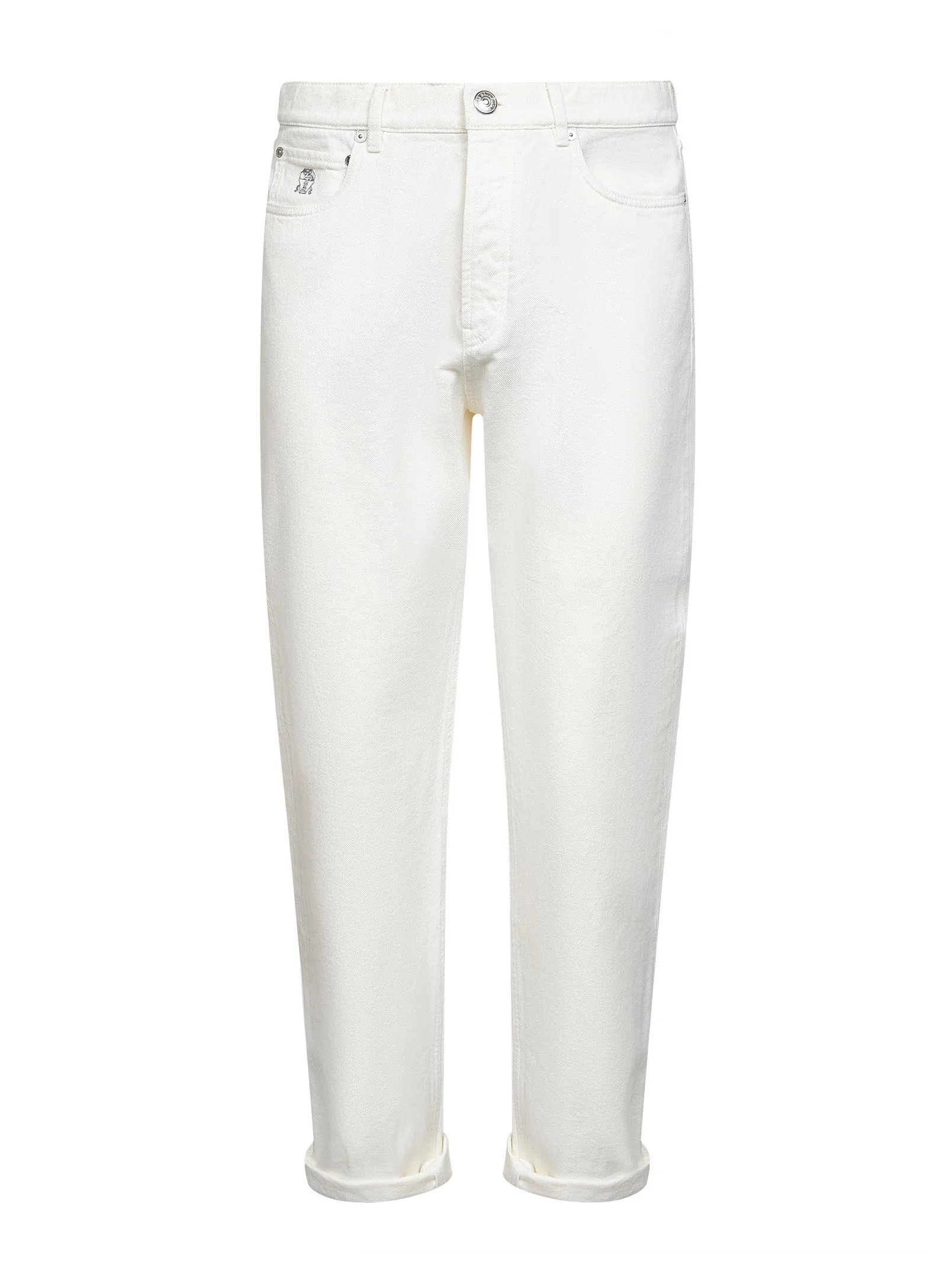 - Front button-fly closure, metal logo button - Slightly high-rise waist with belt loops - Five-pocket model - Leather logo patch at back waistband; solomeo crest embroidery at coin pocket - Regular leg - Garment-dyed model - Iconic fit - White color - 100% cotton - Made in italy Natural (Veg): Cotton100 % Made in: ITALIA Season: P26 M237PO1090-C7210