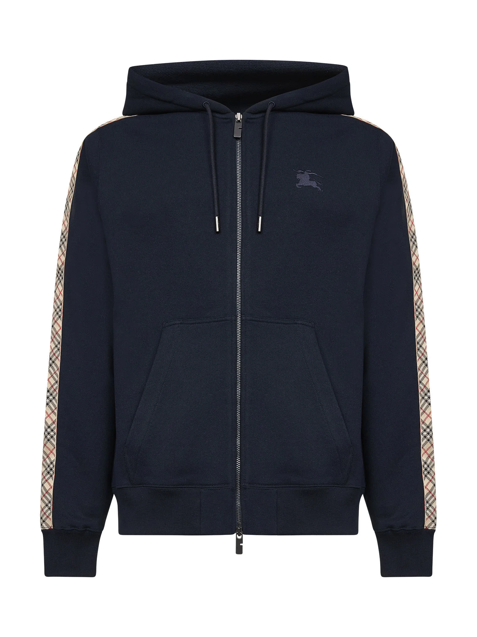 - Front double-slider zip closure - Adjustable drawstring hood - Long sleeves; beige burberry check tapes at shoulders and sleeves - Tone-on-tone equestrian knight design embroidery at chest - Front kangaroo pockets - Ribbed cuffs and bottom band - Lightweight cotton terry design - Slim fit - Blue color - 100% cotton - Made in portugal Natural (Veg): Cotton100 % Made in: Portogallo Season: P26 8118990-A1222