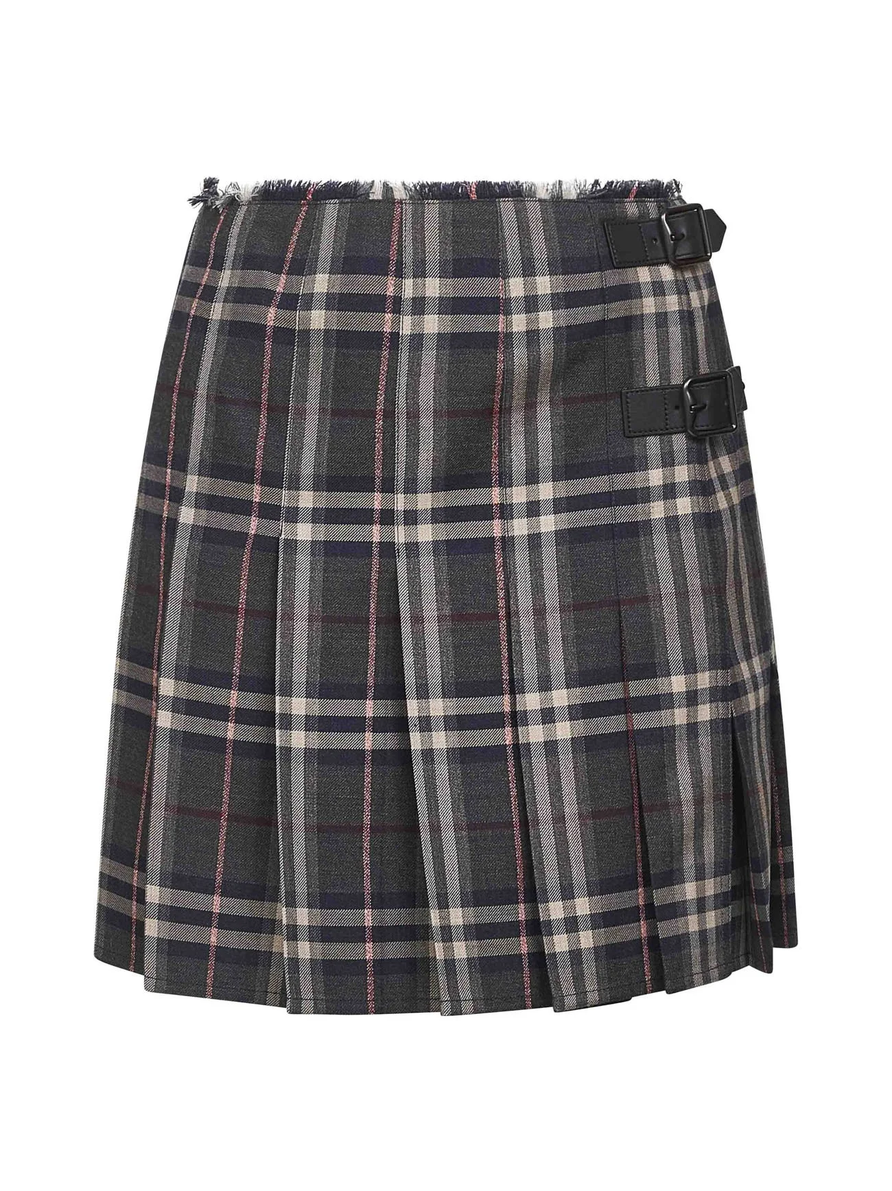 - Side covered buttons and leather straps with metal b-shaped buckle closure; burberry lettering engraved at buckles - Short and thin fringes at waist - Flared bottom - Pleated model - Burberry check motif wool design - Length: 43.5 cm (size uk 8) - Color: multicolor - 100% wool - Made in poland Wool or fine animal hair: Wool100 % Made in: Polonia Season: A25 8110427-C3127