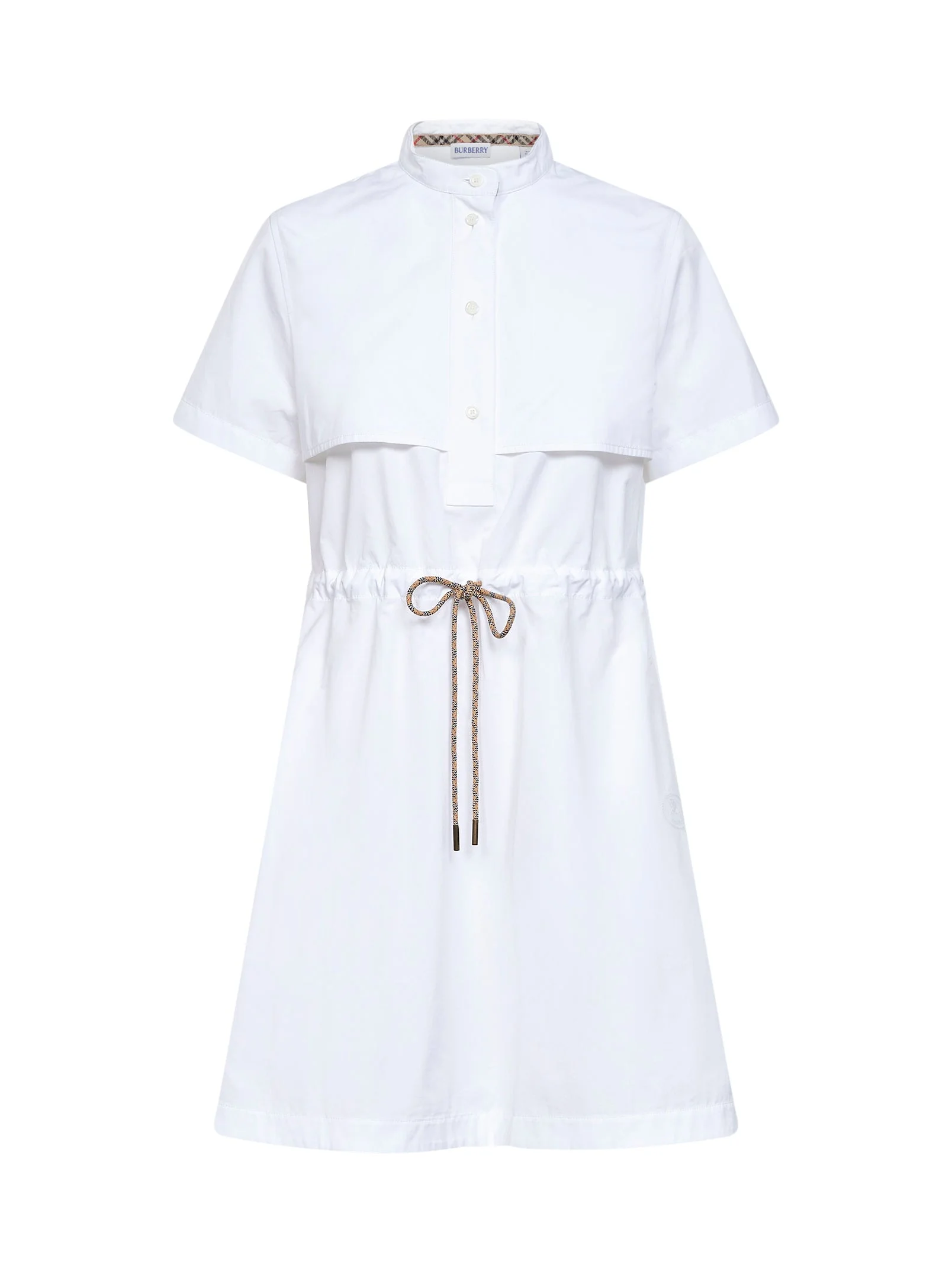 - Front partial button placket - Mandarin collar - Short sleeves - Front gun flaps; back storm shield - Adjustable burberry check drawstring at the waist - Side slanted welt pockets - Tone-on-tone knight stamp embroidered at skirt - Flared skirt - Length: 90 cm (size uk 8) - Regular fit - Optical white color - 100% cotton - Made in extra eu CO Made in: Thailandia Season: P26 8122377-A1462