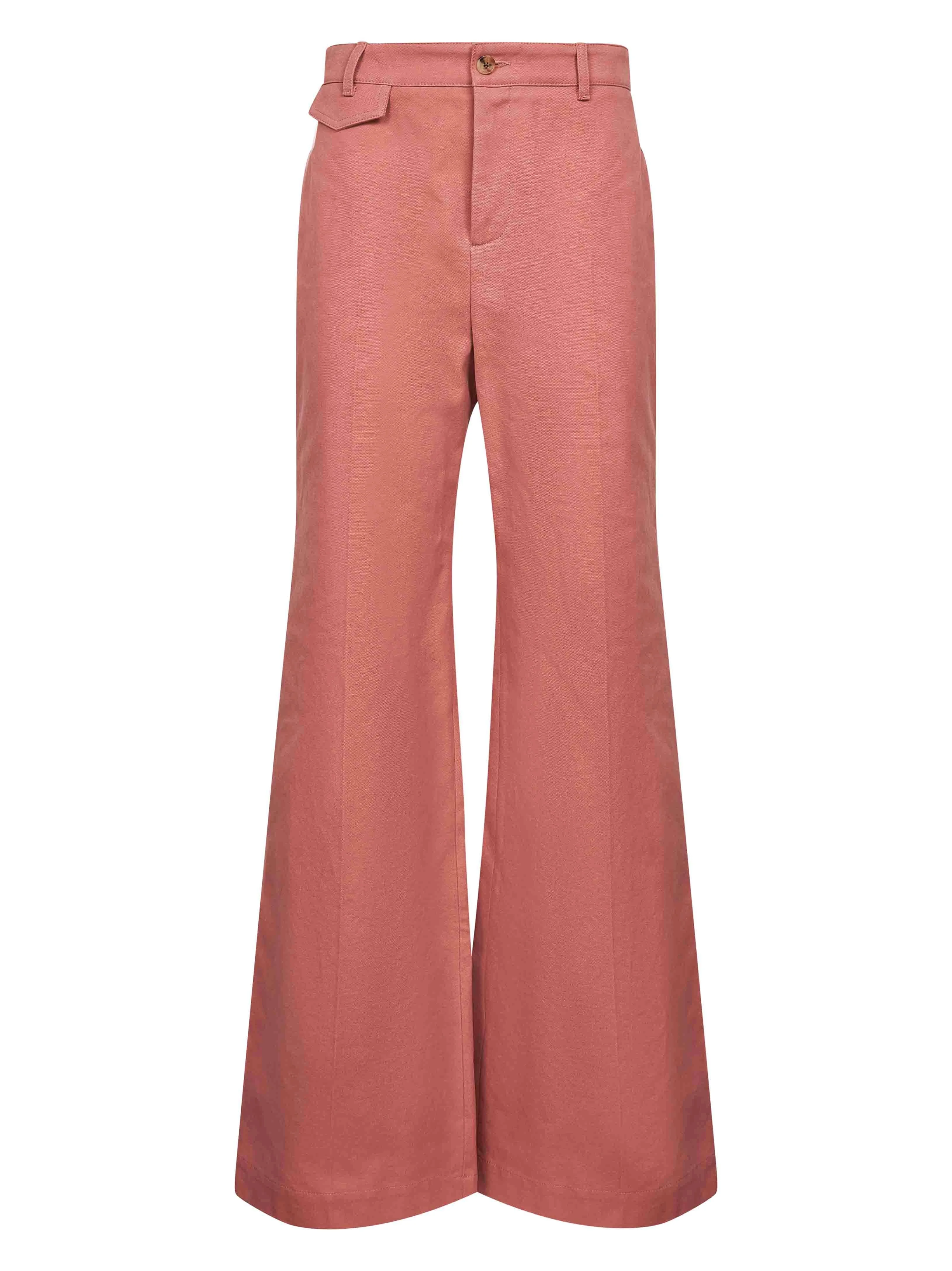 - Front zip fly and button closure; engraved horn button - High waist with belt loops - Side pockets, mini flap pocket at right hip, back welt pockets - Pressed legs creases - Garment-dyed organic cotton canvas design - Flared fit - Pink color - 100% cotton - Made in italy Natural (Veg): Cotton100 % Made in: ITALIA Season: A25 CH25APA063656L7
