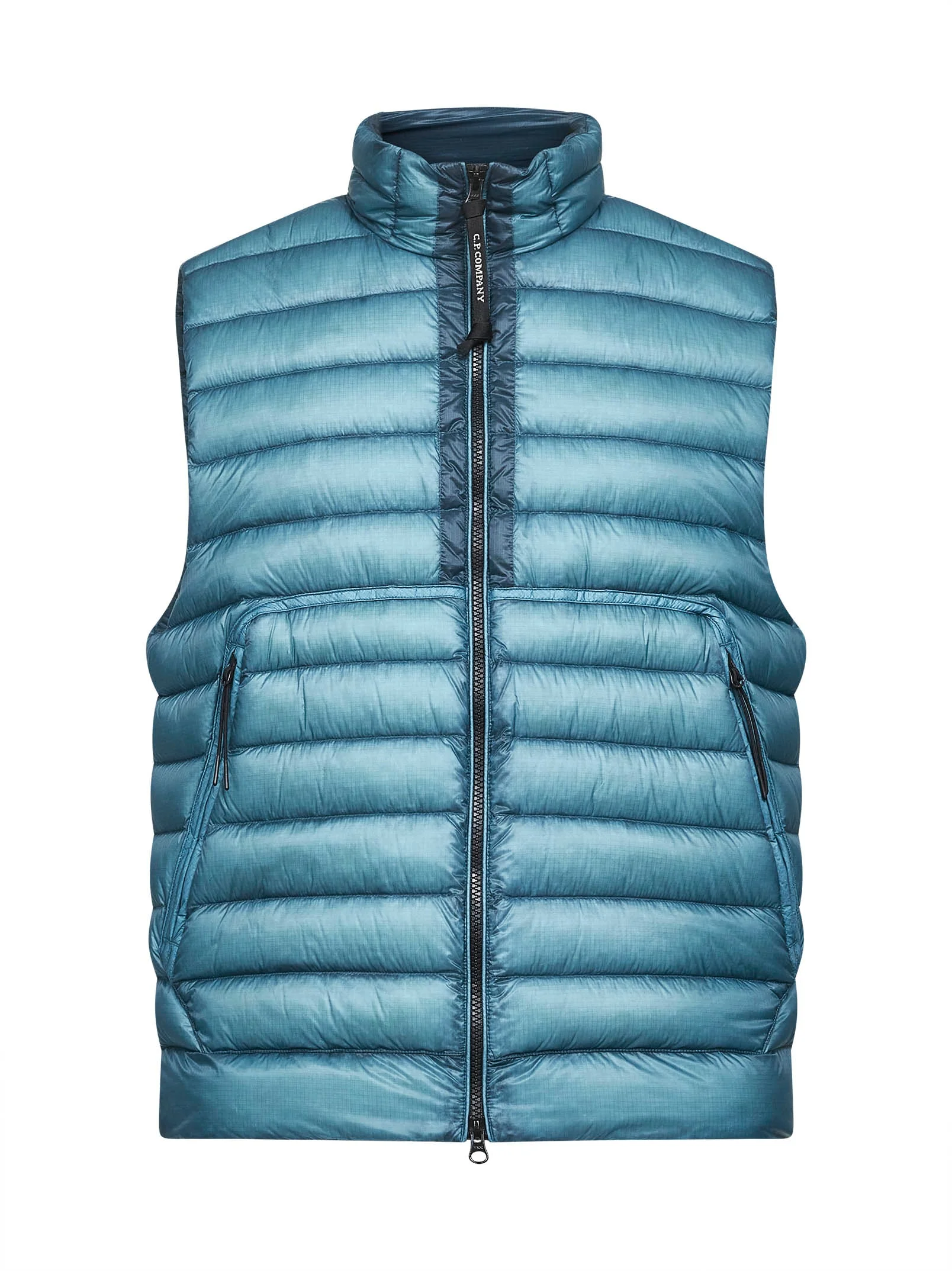 - Front double-slider full zip closure - Stand collar - Sleeveless - Slanted side zipped welt pockets, patch pocket at back with flap and lens detail - Hem with adjustable drawstring - Lined; padded with direct down injection process - D.d. shell design, micro-ripstop opaque 7-denier nylon - Regular fit - Light blue color - 100% polyamide - Made in extra eu Synthetic: Polyamide100 % Made in: Repubblica Popolare Cinese Season: A25 MVE703A110416A815