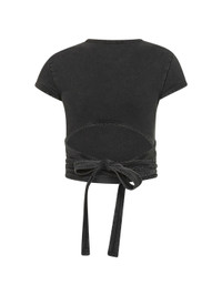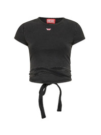 - Ribbed crewneck - Short sleeves - Small embroidered d patch at chest - Self-tie crossed straps at hem; cut-out detail at back - Washed black denim-effect stretch cotton jersey design - Slightly cropped cut - Fitted fit - Black color - 95% cotton, 5% elastane - Made in extra eu Natural (Veg): Cotton95 % Synthetic: Elastane5 % Made in: India Season: A25 A195200KIBY02A