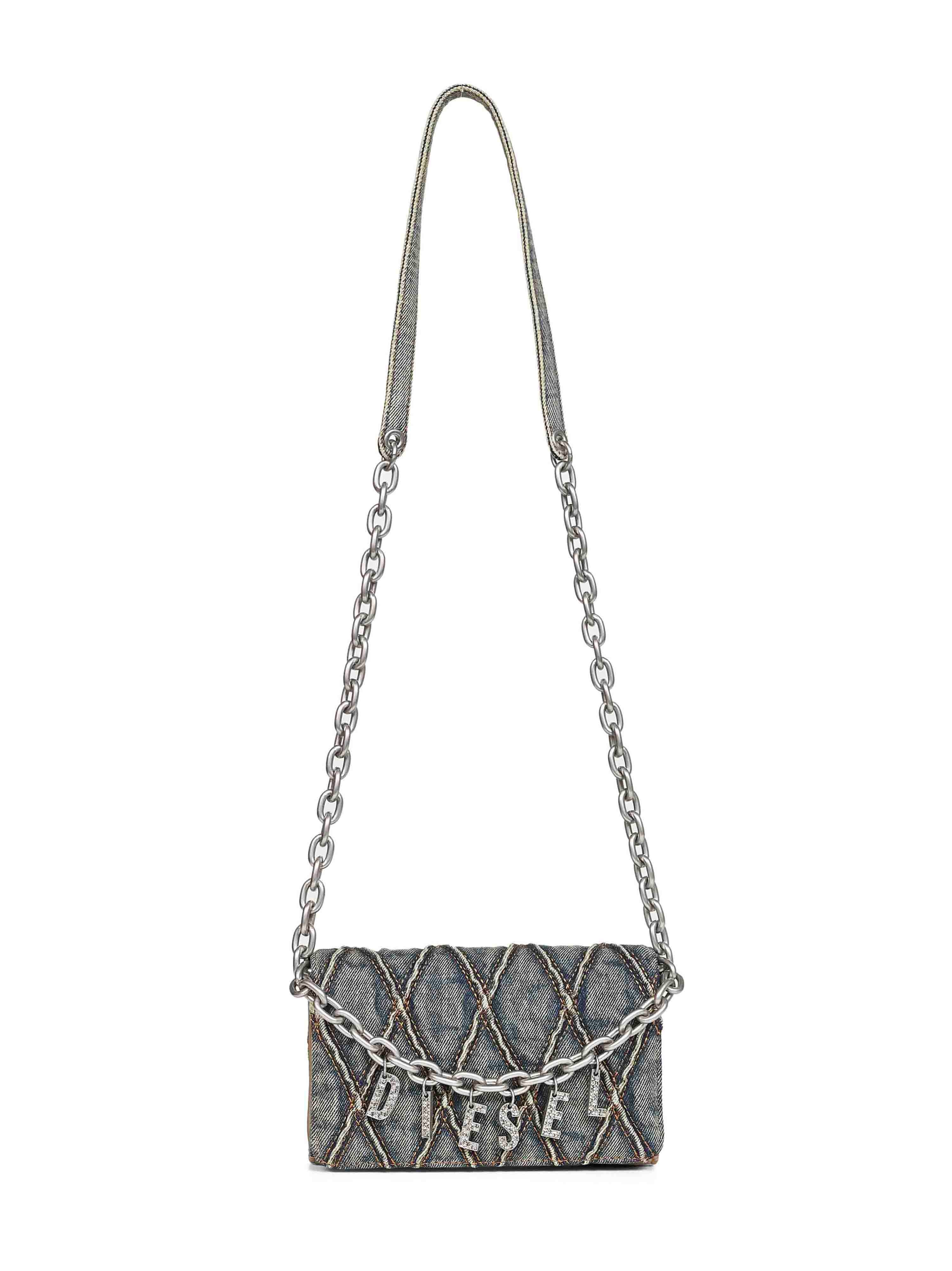 - Foldover-top with snap button fastening - Detachable chunky metal chain handle with crystal logo lettering; detachable chunky metal chain shoulder strap with denim pad - Interior: two main gusseted compartments, flat partition pocket, zipped coin pocket, flat pocket under the flap, eight credit card slots - Diamond-quilted dirty-wash denim design - 20 x 13 x 3 cm; shoulder strap drop: 52 cm - Blue color - 90% cotton, 10% polyurethane - Made in extra eu Natural (Veg): Cotton90 % Synthetic: Polyamide5 % Synthetic: Elastane5 % Made in: Repubblica Popolare Cinese Season: A25 X10281P5570HA001