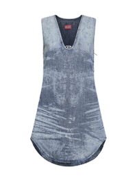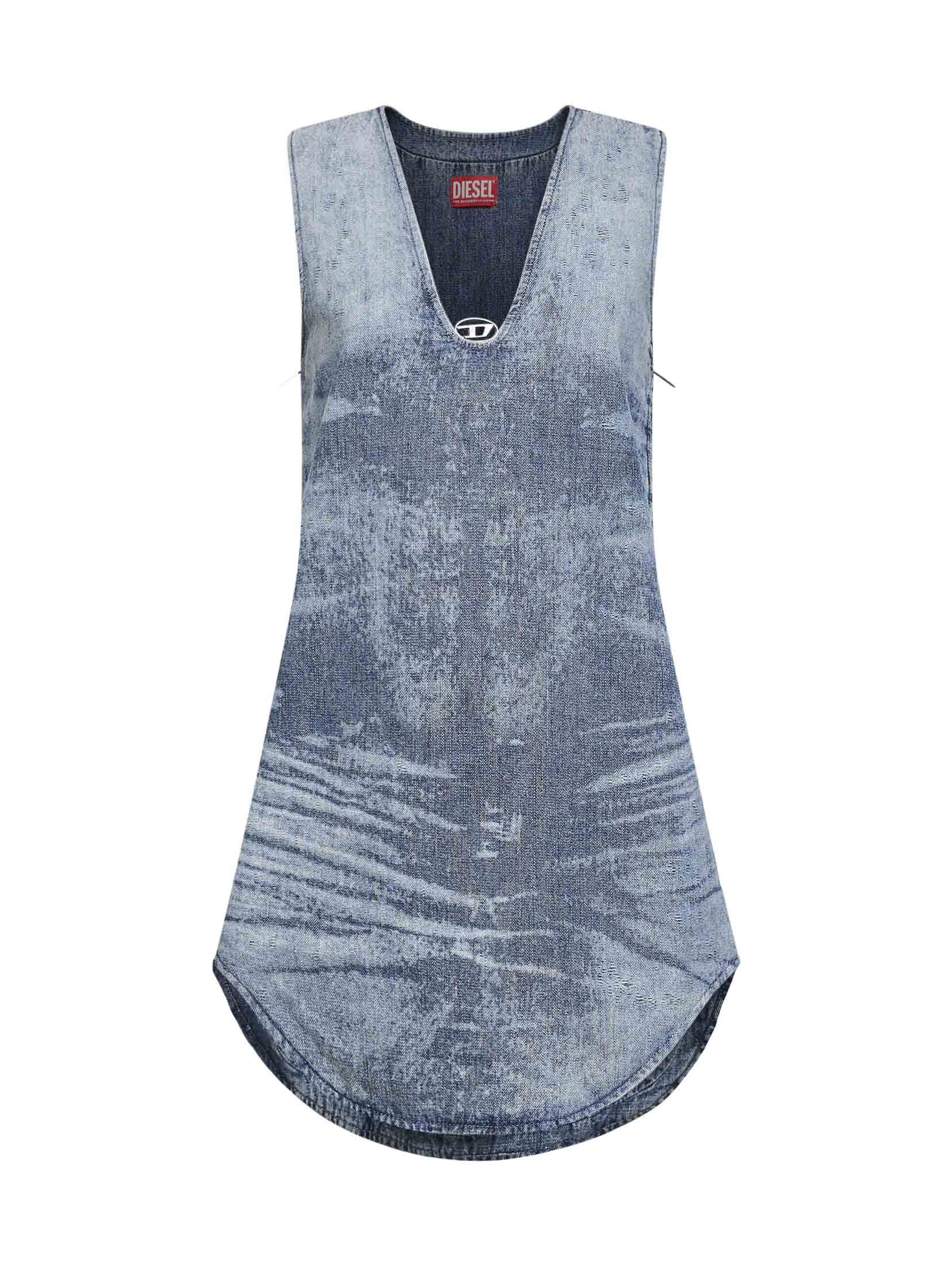 - Side zip closure - V-neckline with oval d metal logo plate at front - Wide shoulder straps; sleeveless - Shaped hem - Light blue jacquard weave stonewashed denim design; nebulised bleach effects and laser technology - Light blue color - 100% cotton - Made in extra eu Natural (Veg): Cotton100 % Made in: Tunisia Season: A25 A21707068TY01