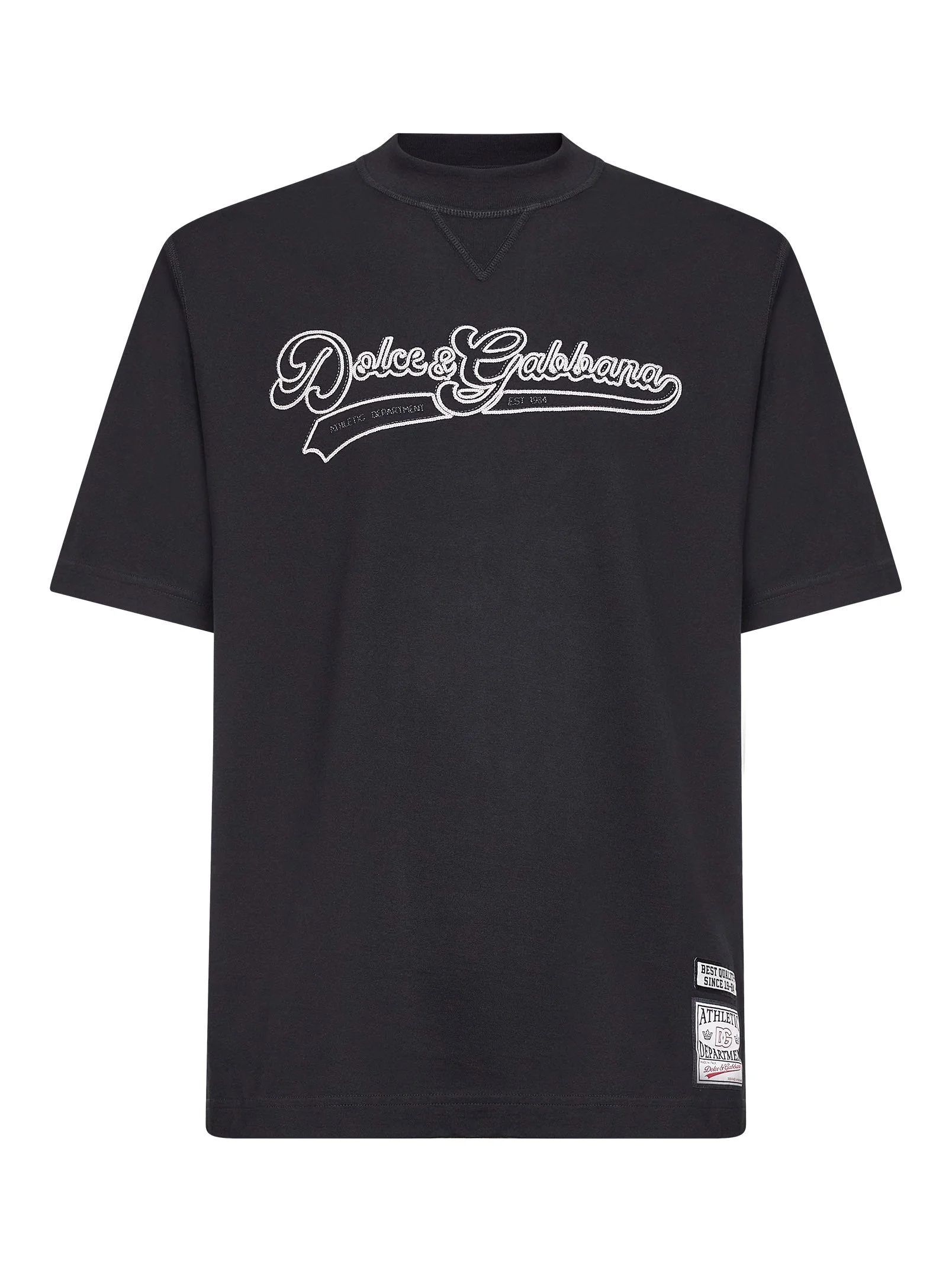 - Ribbed crewneck; ribbed v insert at front - Short sleeves - Contrasting sequin dolce&gabbana logo embroidered at front - Embroidered logo labels at bottom front - Straight hem - Classic fit - Black color - 100% cotton - Made in italy Natural (Veg): Cotton100 % Made in: Italy Season: P26 G8TO6ZG7PONN0000