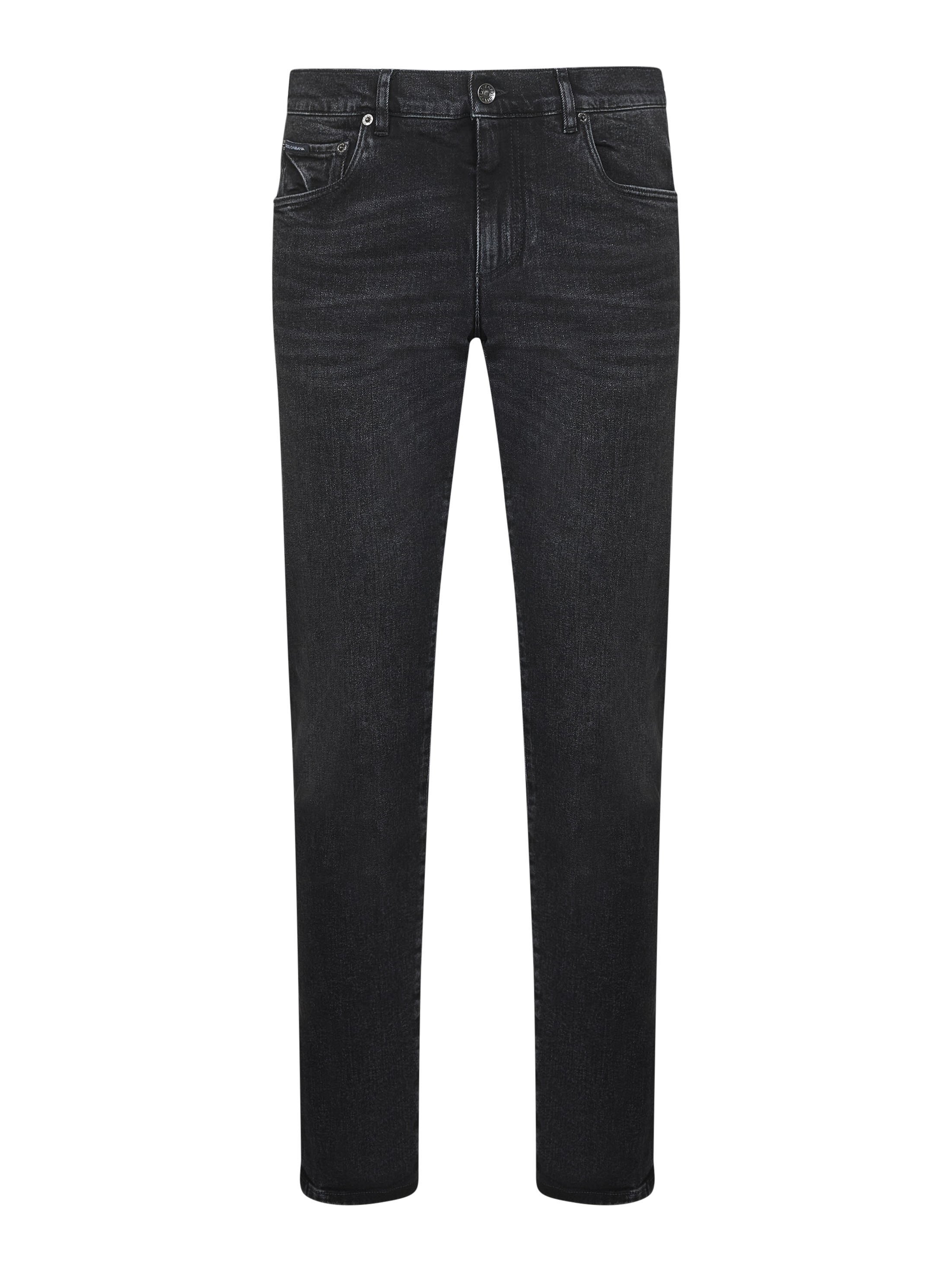 - Covered front closure, metal logo button - Waist with belt loops - Five-pocket model - Logo label at coin pocket; metal dolce&gabbana logo plate at back pocket - Light whiskering - Slim fit - Black color - 99% cotton, 1% elastane - Made in italy Natural (Veg): Cotton99 % Synthetic: Elastane1 % Made in: Italy Season: A25 GY07CDG8NK9S9001