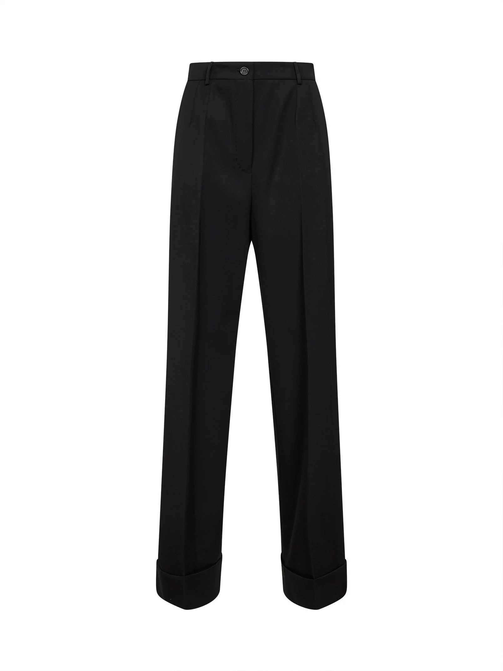 - Front zip-fly and button closure - High-rise dolce waist with belt loops - Side pockets, back buttone welt pockets - Double front pleat - Turn-up hems; height: 8 cm - Pressed legs creases - Straight leg - Leg opening: 30 cm (size it 40) - Black color - 100% virgin wool - Made in italy Wool or fine animal hair: Virgin Wool100 % Made in: Italy Season: P26 FTBM0TFU2OWN0000