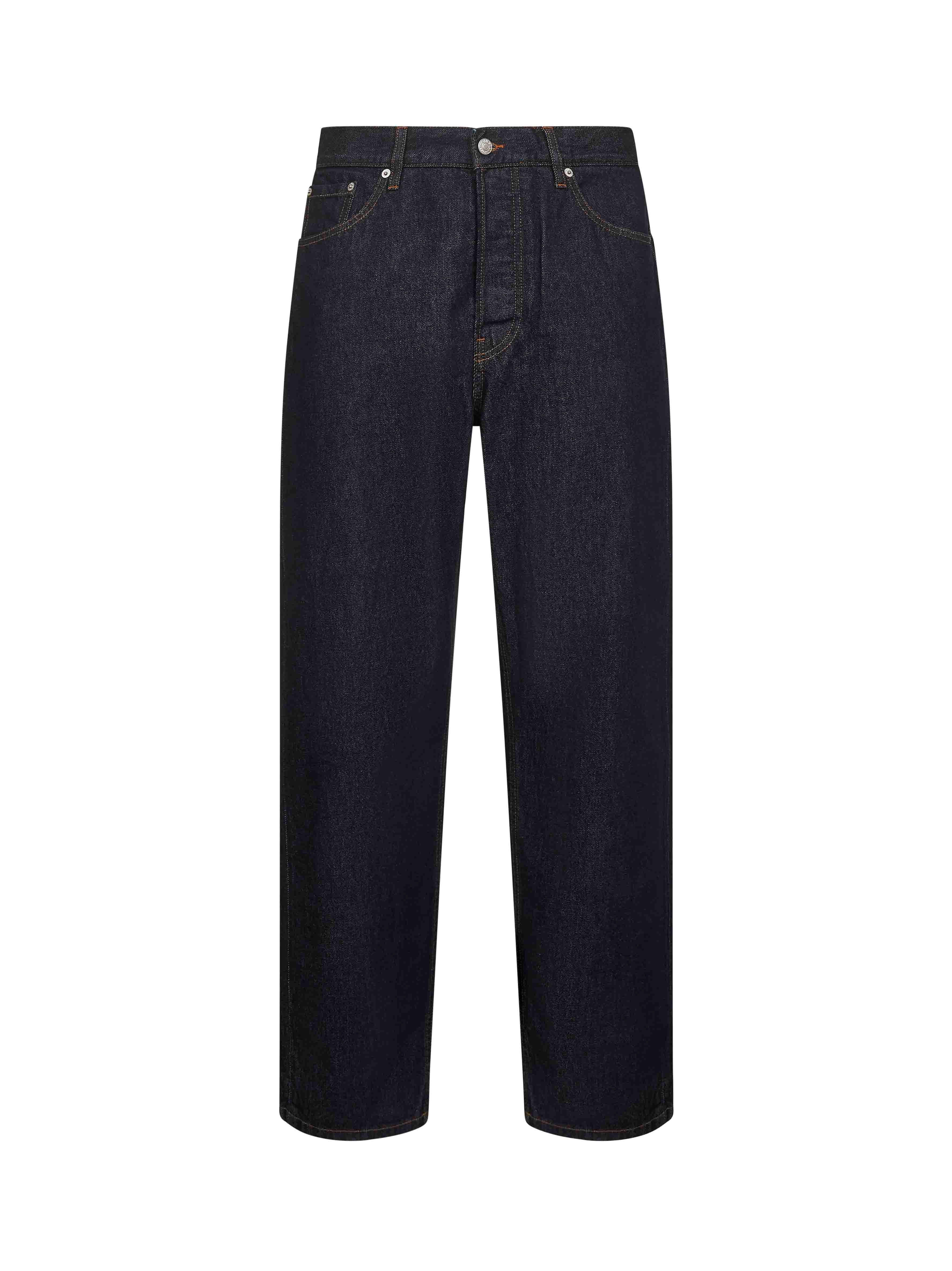 - Covered front closure, metal logo button - Waist with belt loops - Five-pocket model - Leather logo patch at back waistband - Contrasting topstitching - Straight leg - Blue color - 100% cotton - Made in extra eu Natural (Veg): Cotton100 % Made in: Tunisia Season: A25 0209272380507