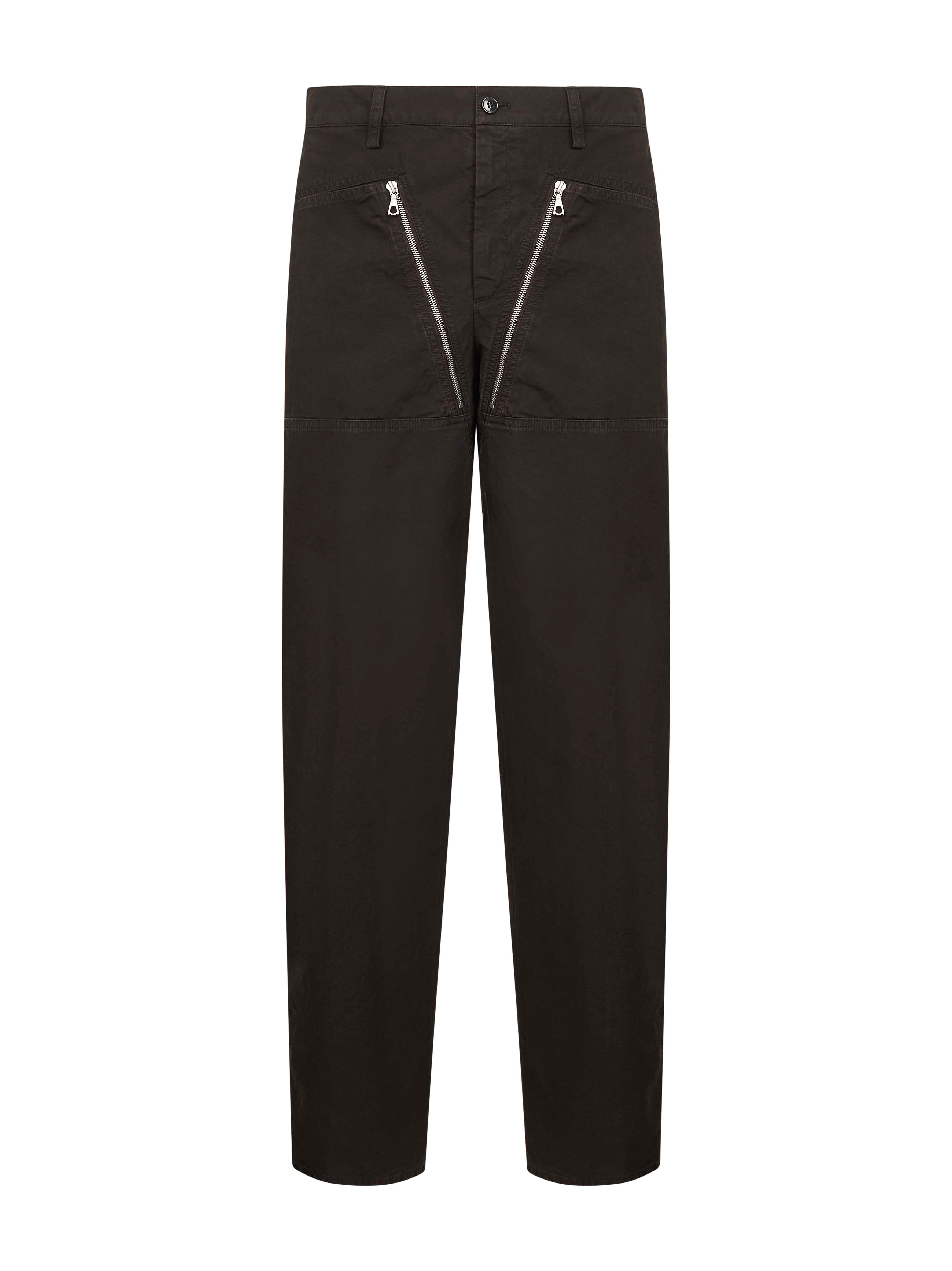 - Front zip fly and button closure - Waist with belt loops - Front bellows pockets with metal zip closure, back welt pockets - Side metal zip at legs bottom - Straight leg - Brown color - 100% cotton - Made in romania Natural (Veg): Cotton100 % Made in: Romania Season: A25 0209402101703
