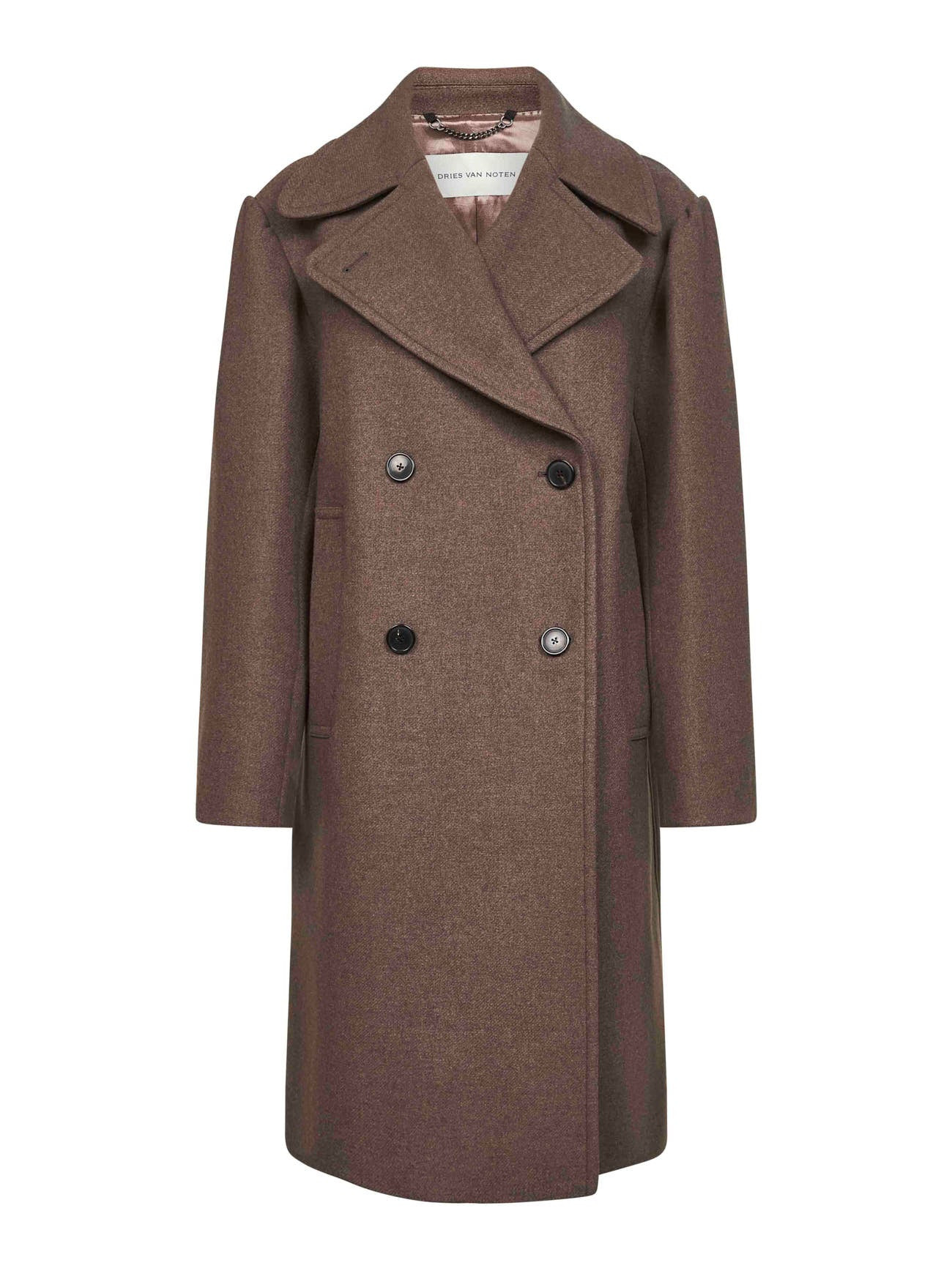 - Double-breasted four-button placket - Lapel collar - Long puff sleeves, dropped shoulders, four-button cuffs - Side welt pockets - Lined - Loose fit - Brown color - 70% wool, 30% polyamide - Made in poland Wool or fine animal hair: Wool70 % Synthetic: Polyamide30 % Made in: Polonia Season: A25 0102702216811