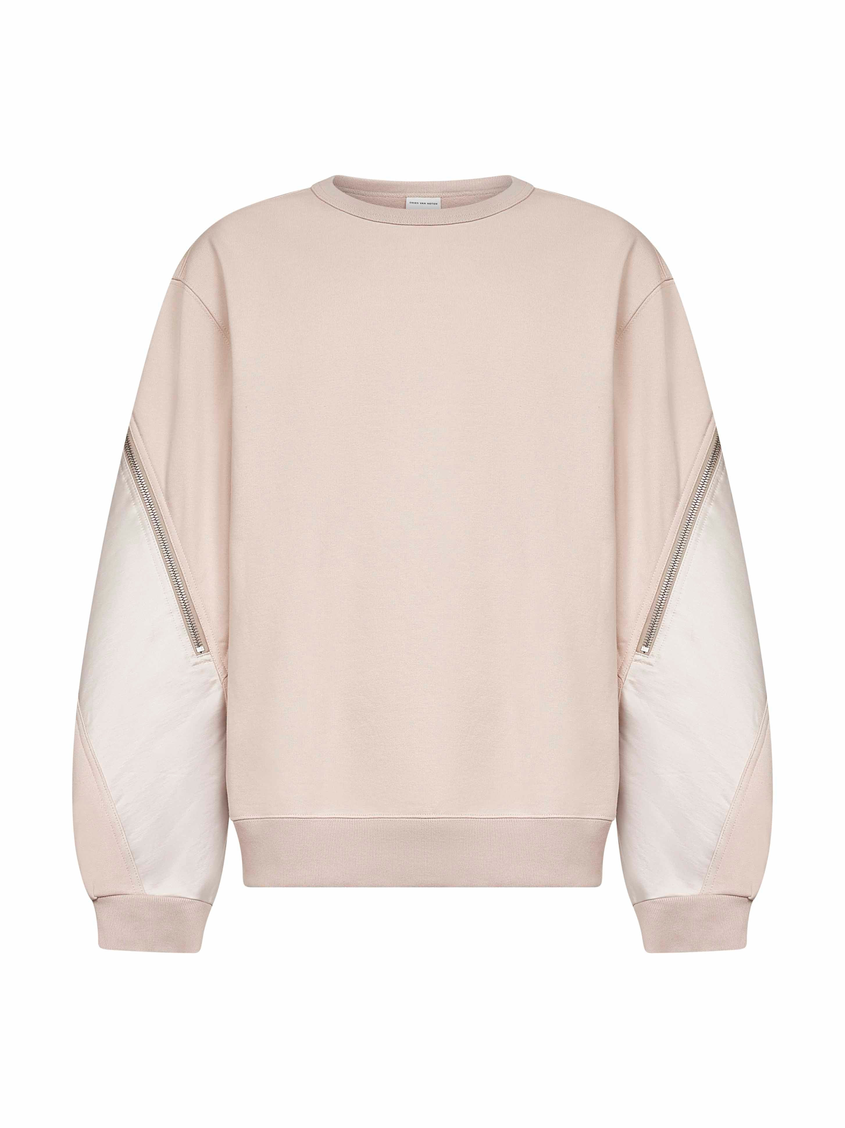 - Ribbed crewneck - Long sleeves, dropped shoulders - Contrasting nylon panels at sleeves and back yoke with silver metal zip detailing - Ribbed cuffs and bottom band - Loose fit - Pink color - 93% cotton, 7% polyester - Made in extra eu Natural (Veg): Cotton93 % Synthetic: Polyester7 % Made in: Turchia Season: A25 021154261112
