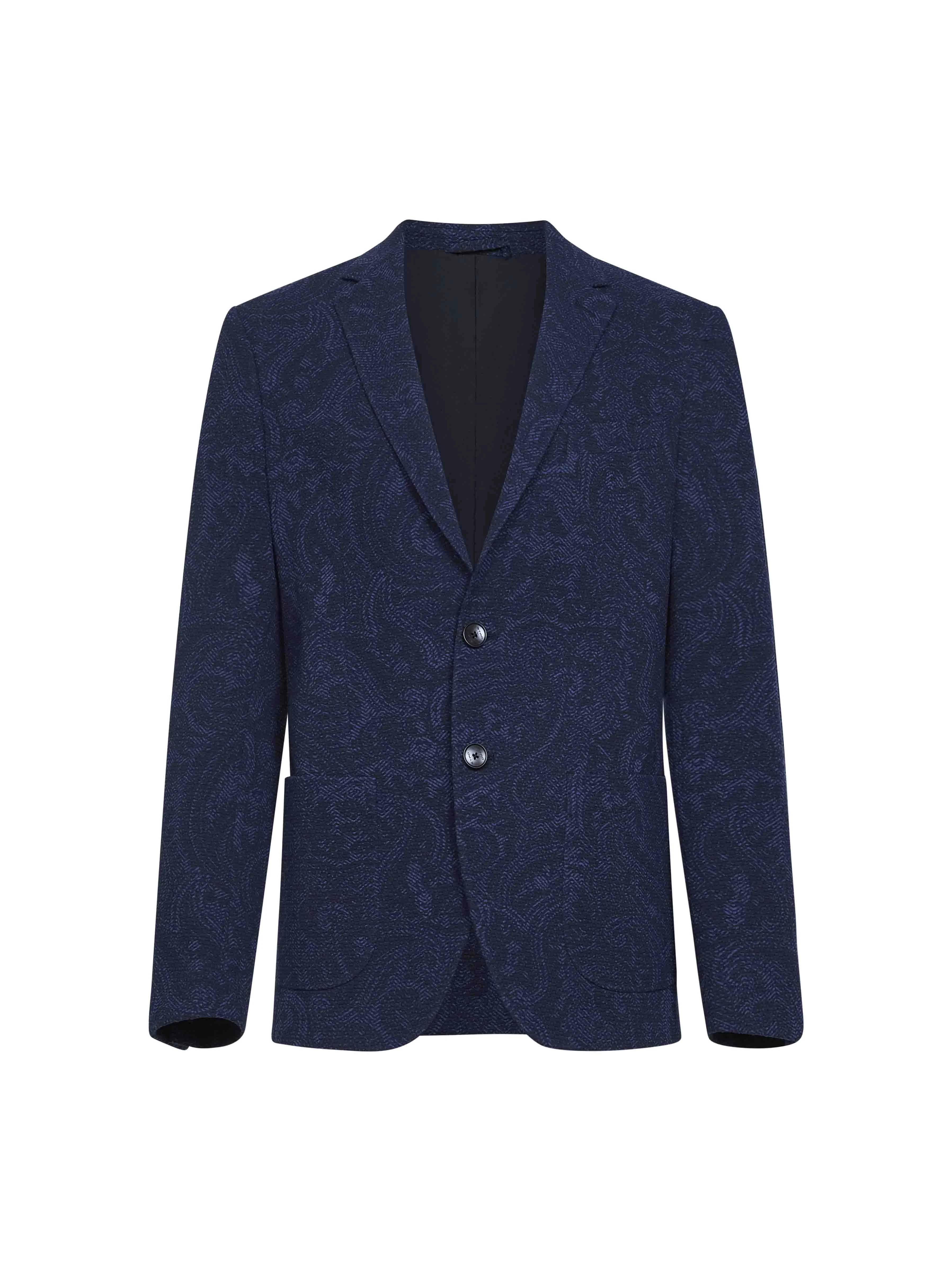 - Single-breasted two-button placket - Notch lapel - Long sleeves, four-button cuffs - Front patch pockets, chest pocket - Side slits at back - Fully lined - All-over jacquard paisley pattern - Regular roma fit - Blue color - 58% polyester, 40% cotton, 2% elastane - Made in italy Synthetic: Polyester58 % Natural (Veg): Cotton40 % Synthetic: Elastane2 % Made in: ITALIA Season: P26 MRCB000599JAE01X0883