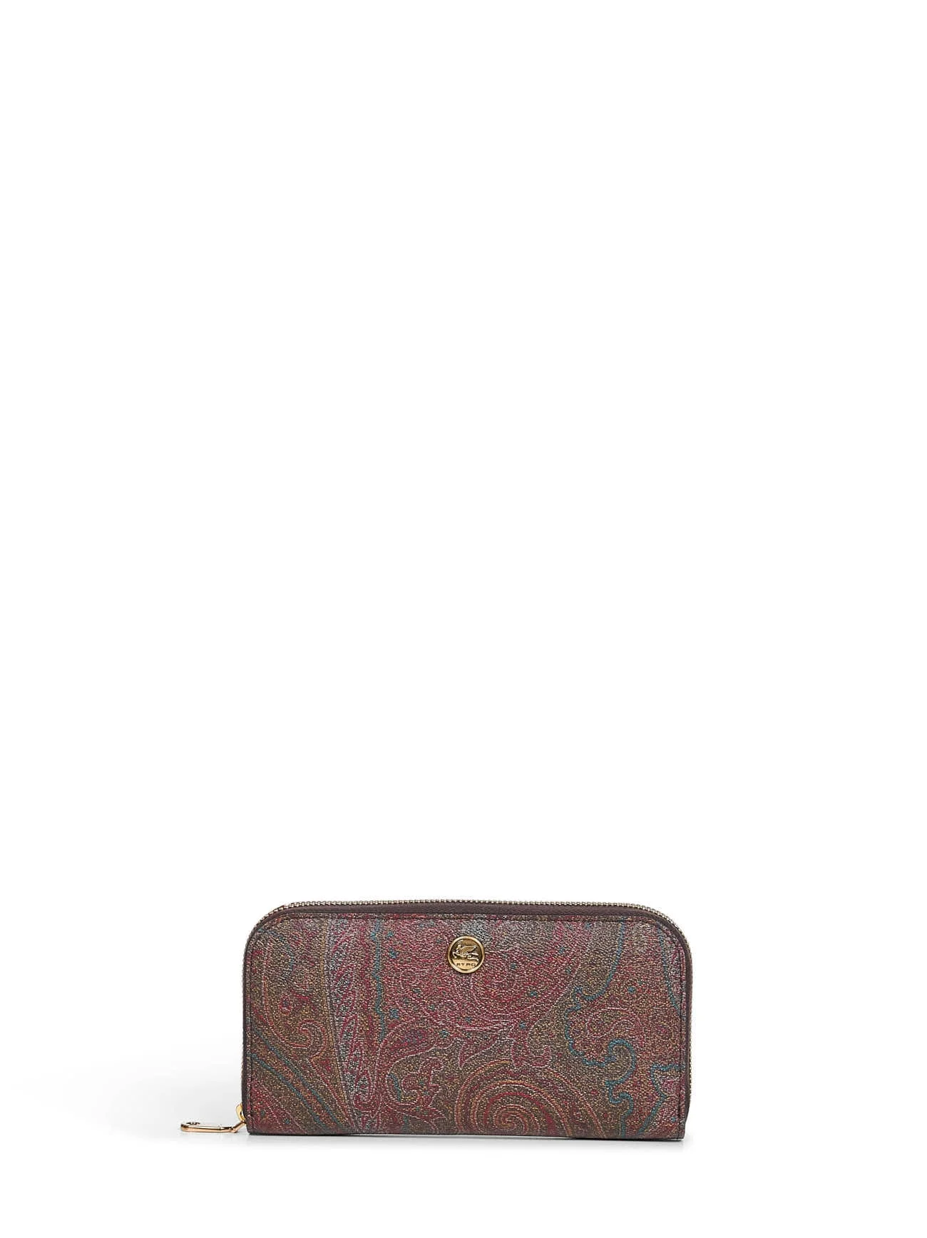 - Zip fastening on three sides - Minted metal coin with etro and pegaso logo at front - Interior: two main gusseted compartments, zipped partition pocket, bills pocket, credit card slots - Gold-toned metal hardware - Paisley jacquard canvas design - 18.9 x 10 x 2 cm - Brown color - 76% cotton, 24% polyester - Made in italy Natural (Veg): Cotton76 % Synthetic: Polyester24 % Made in: ITALIA Season: P26 WP2D0006AA027M0019